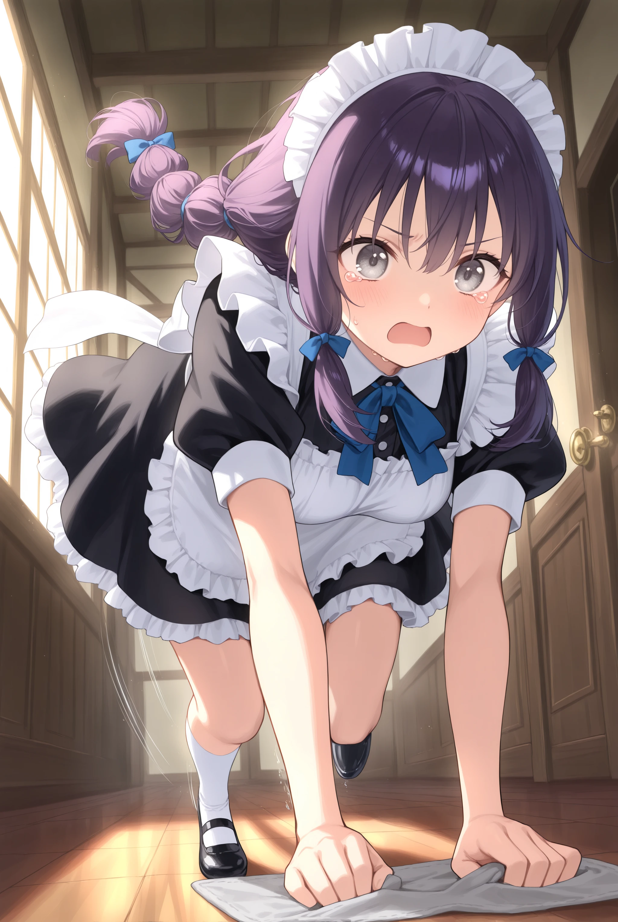 This LoRA involves cleaning by placing a damp rag on the floor and pressing down with both hands.