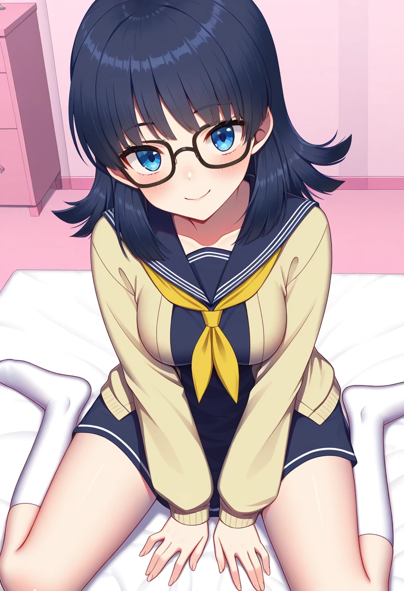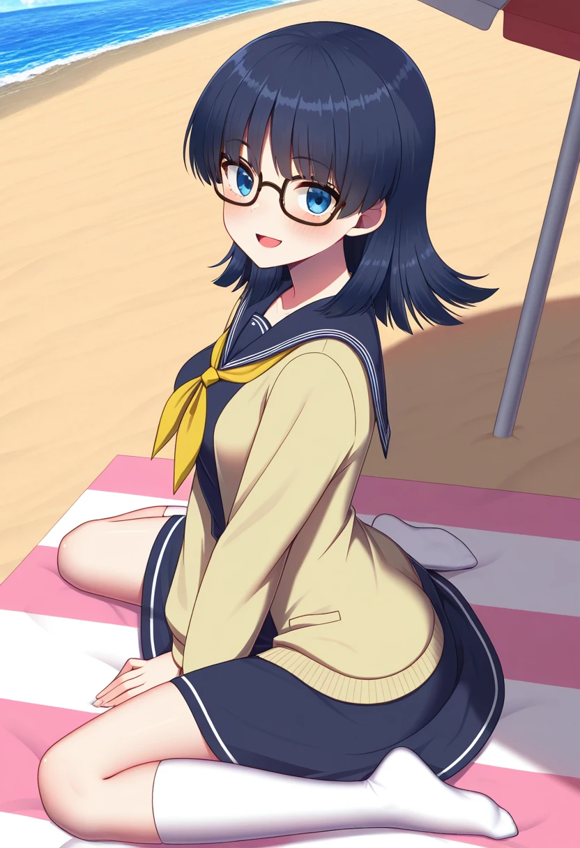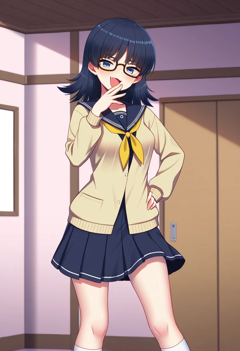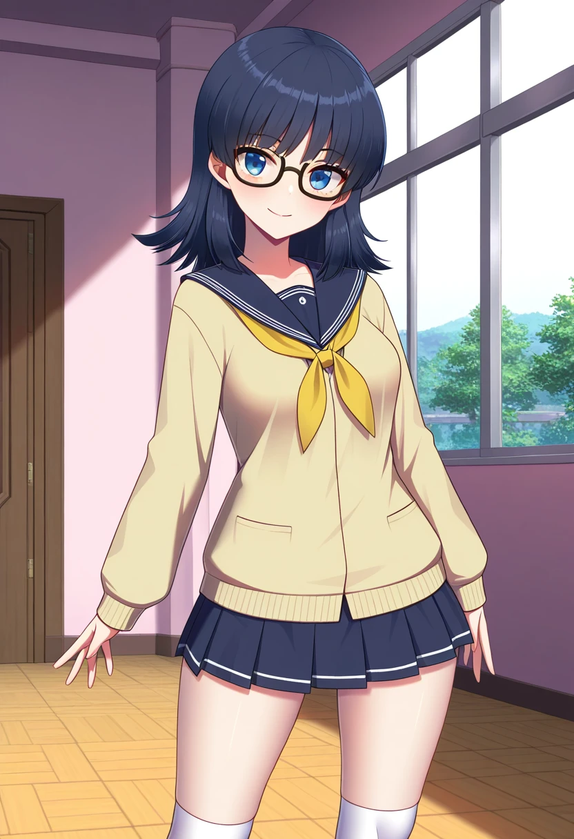 shinguji academy uniform, yellow cardigan, sailor collar, sailor dress, yellow neckerchief, white kneehighs,