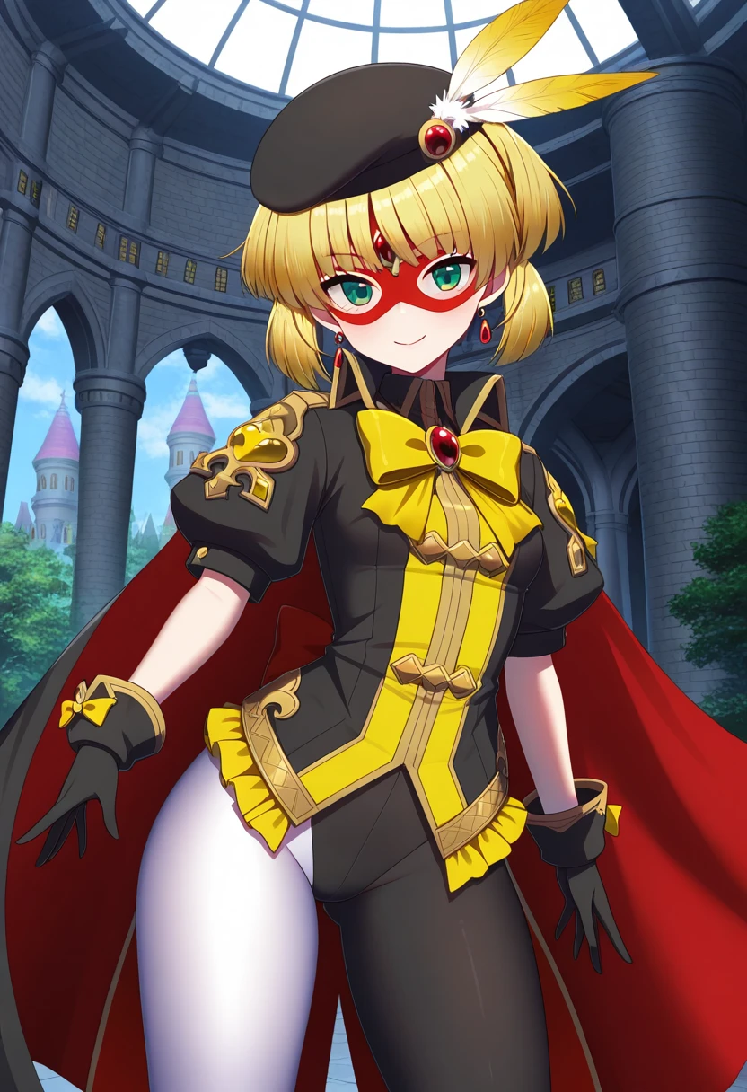 • chris-lightning costume, black cape, black beret, hat feather, yellow bow, short sleeves, black gloves, asymmetrical legwear, white pantyhose, black pantyhose,