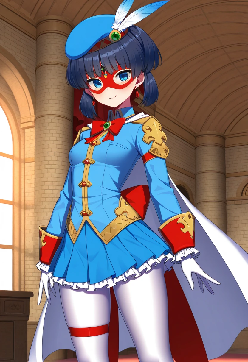 • chris-basic costume, white cape, blue beret, hat feather, red bow, long sleeves, white gloves, blue pleated skirt, frilled skirt, miniskirt, white pantyhose, single thigh strap,
