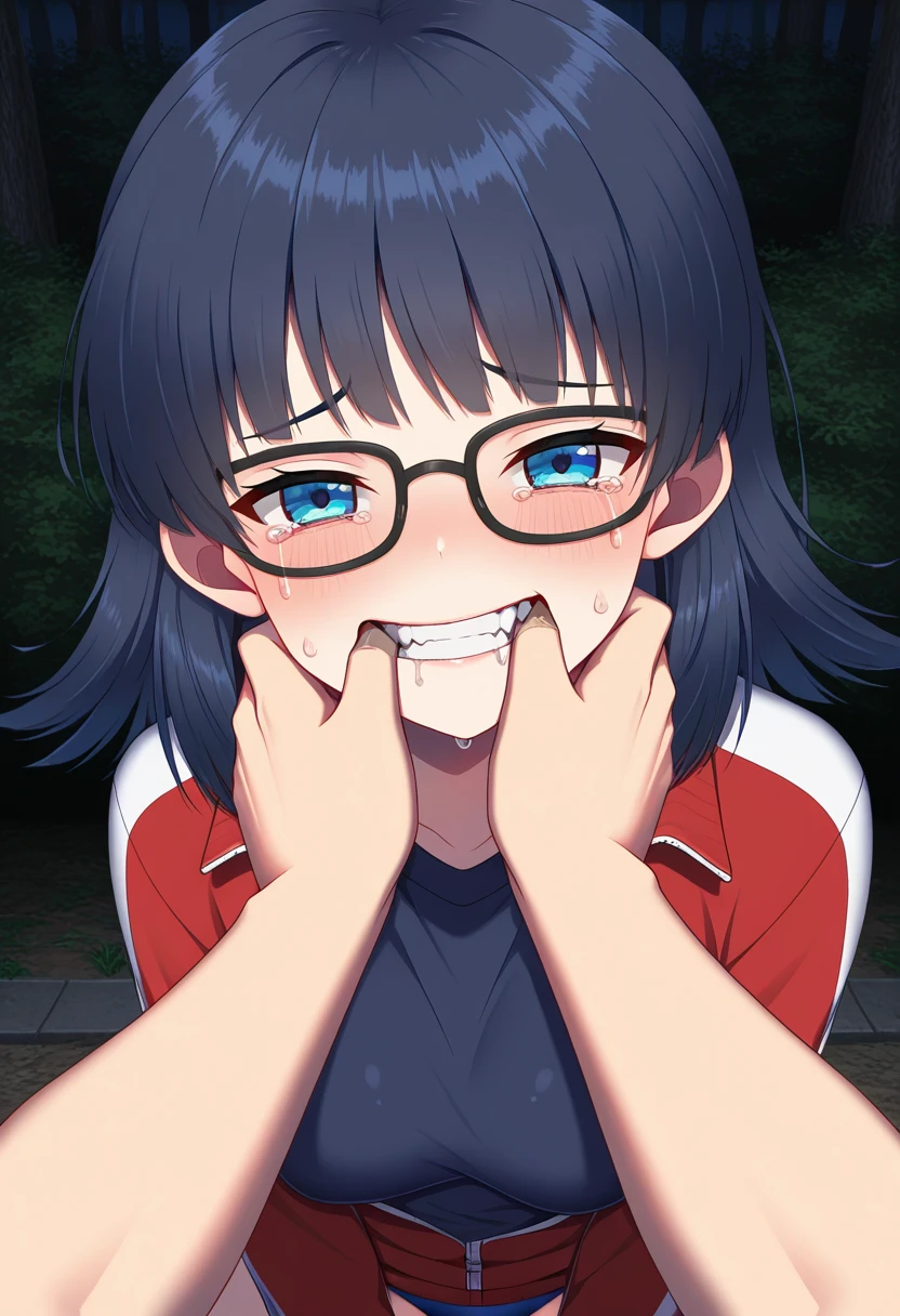 chrisww, blue eyes, glasses, black hair, medium hair, flipped hair, medium breasts,