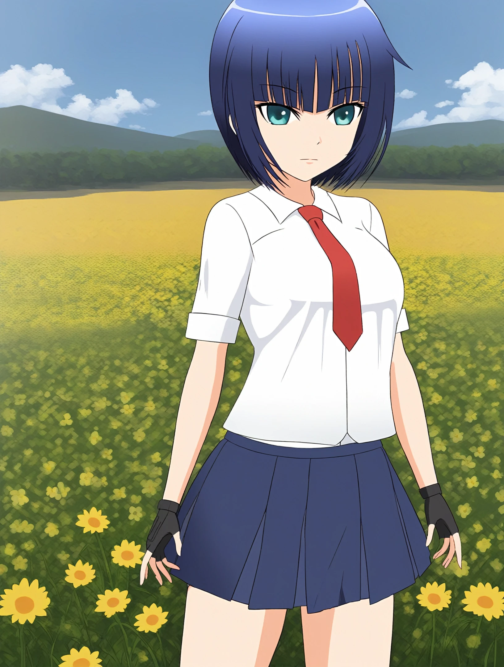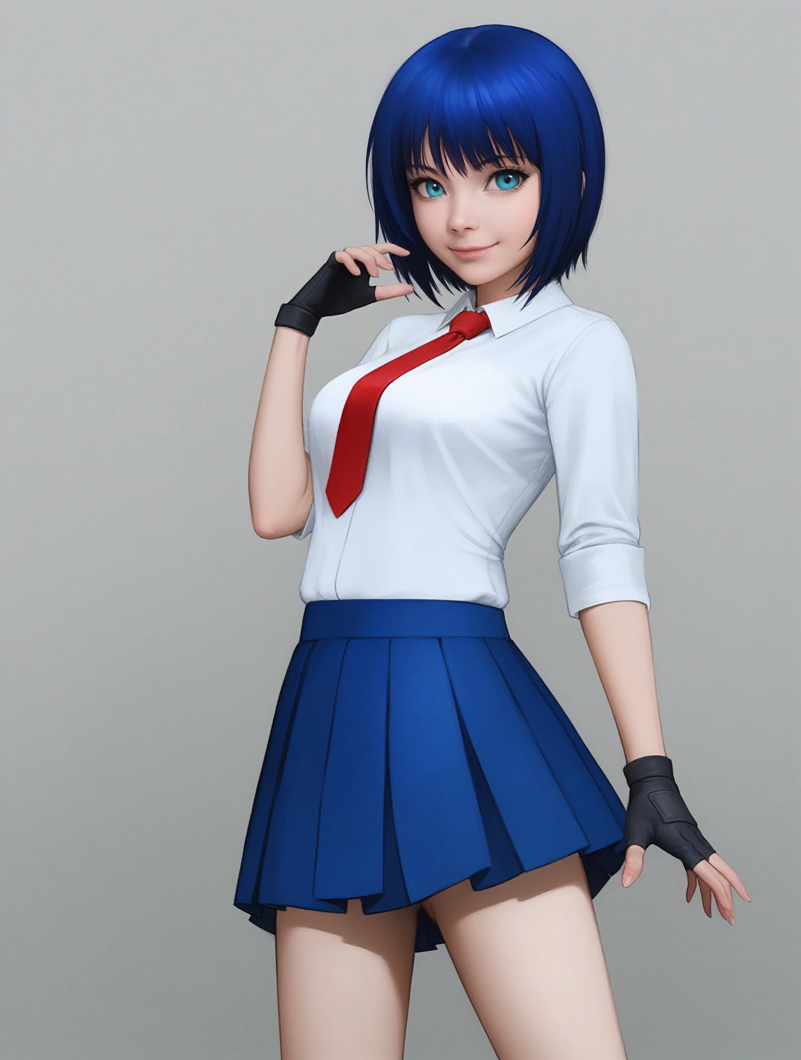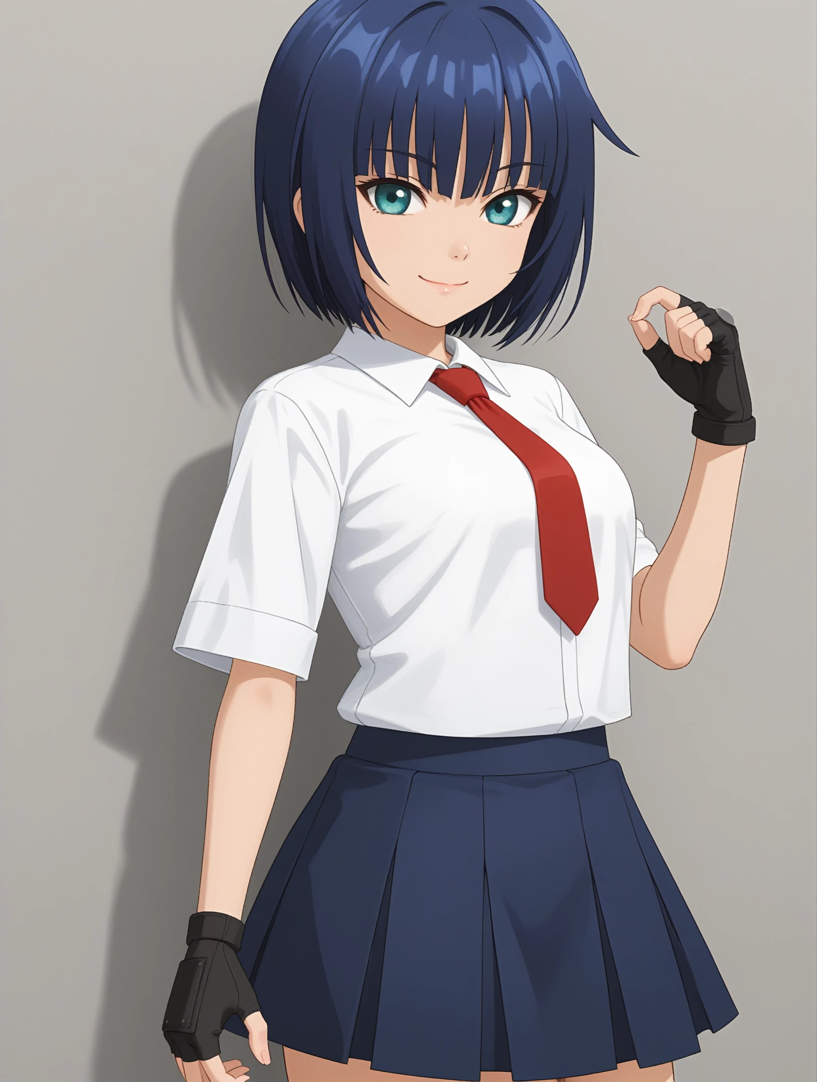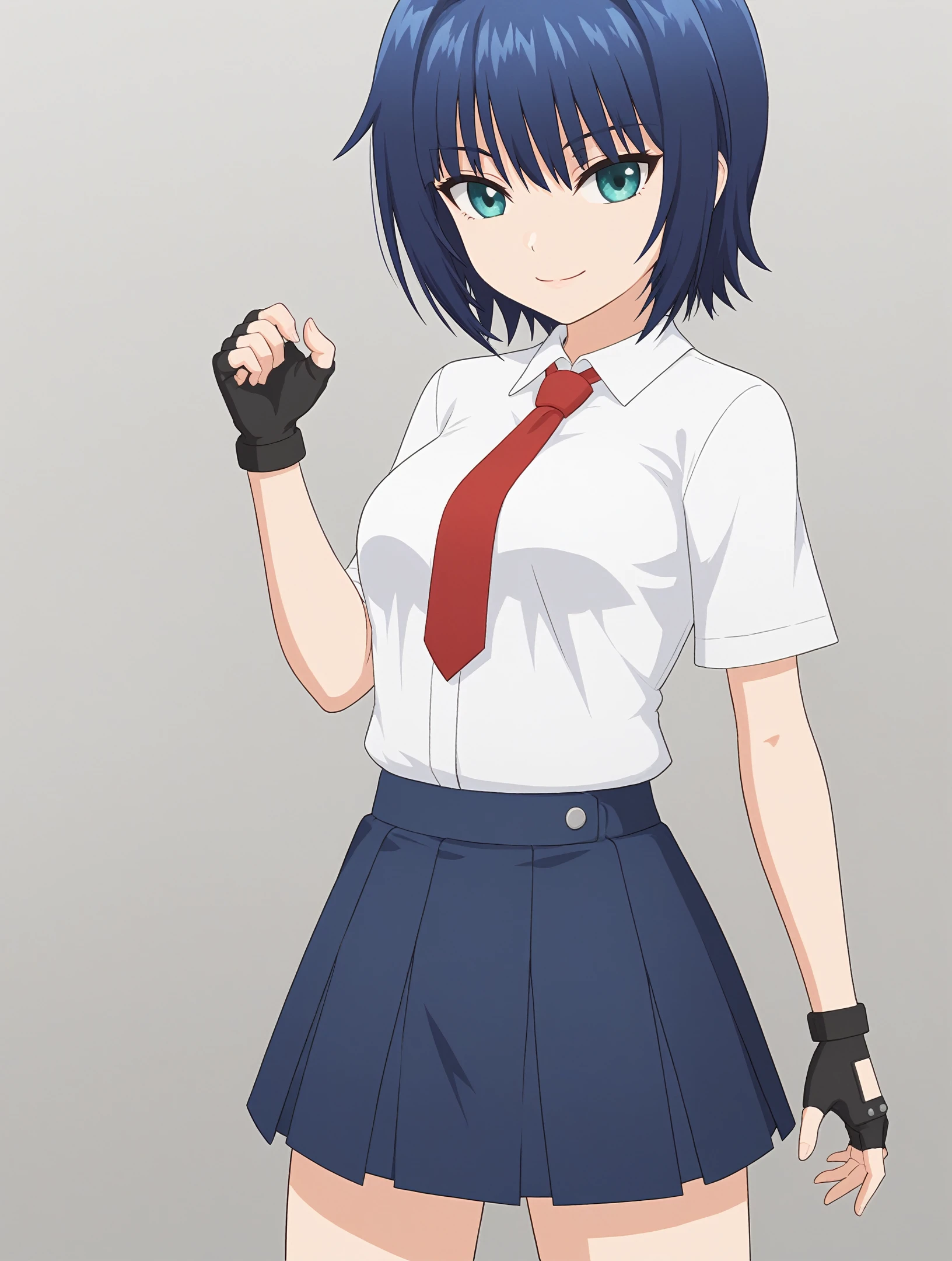 white shirt, red necktie, blue skirt, fingerless gloves