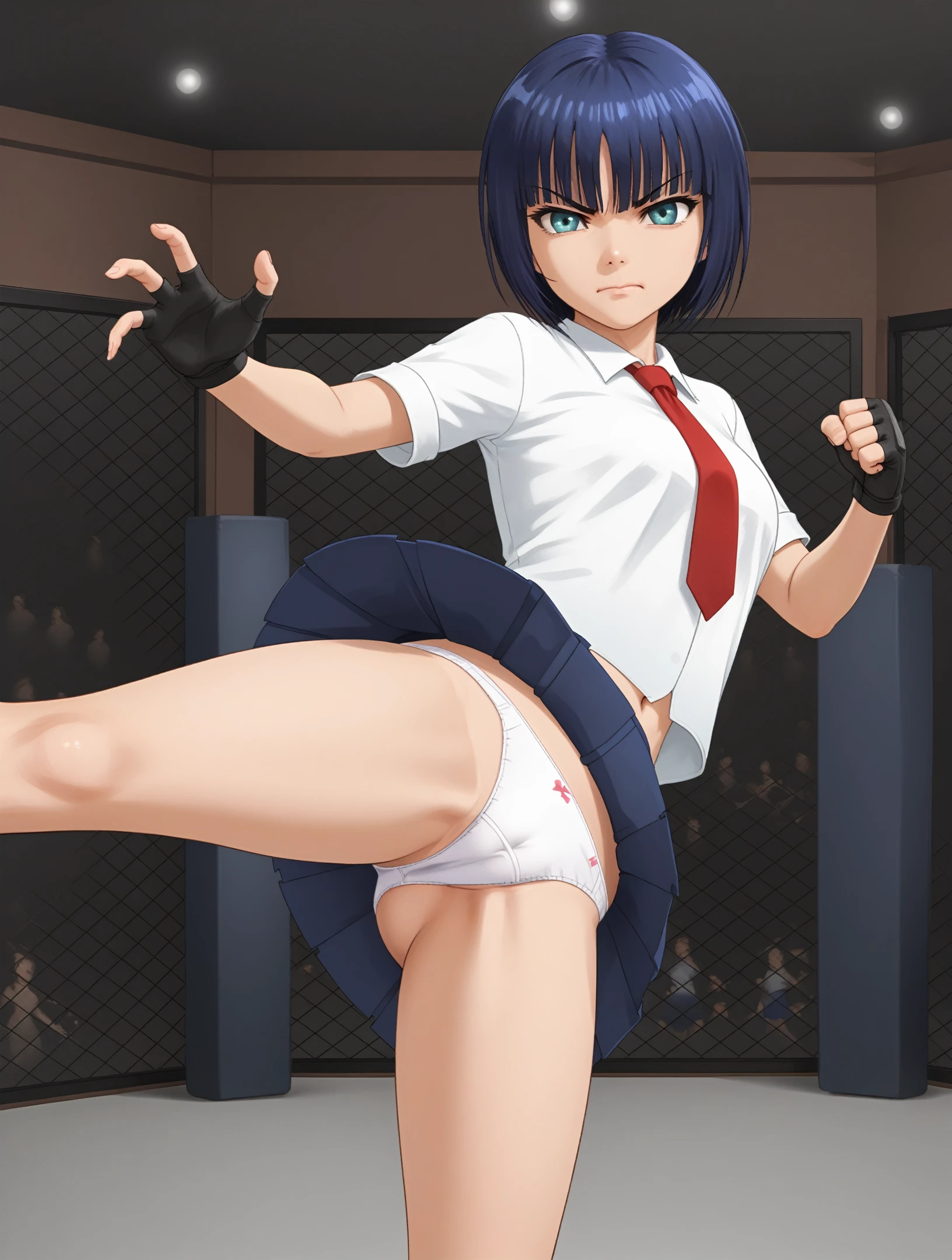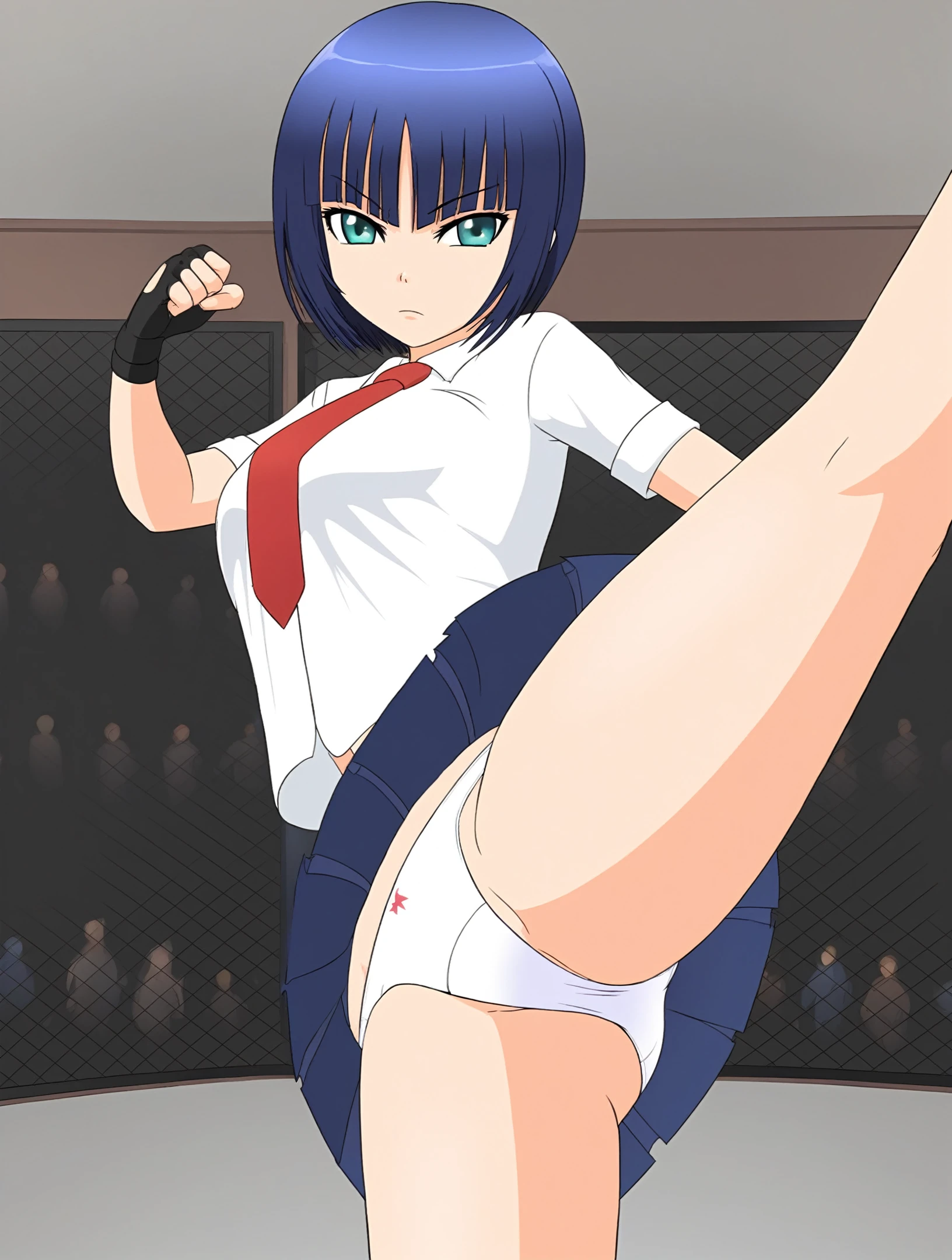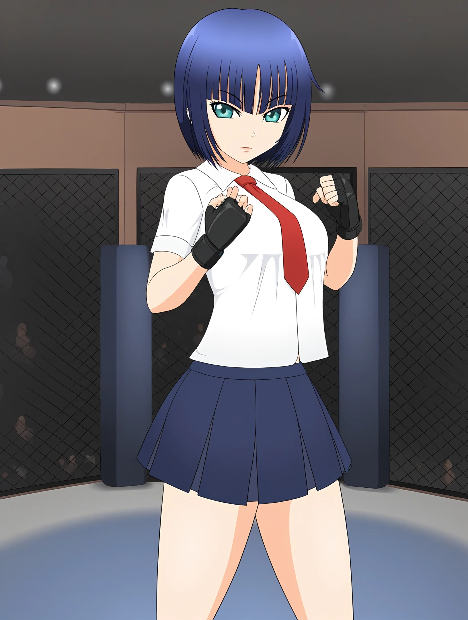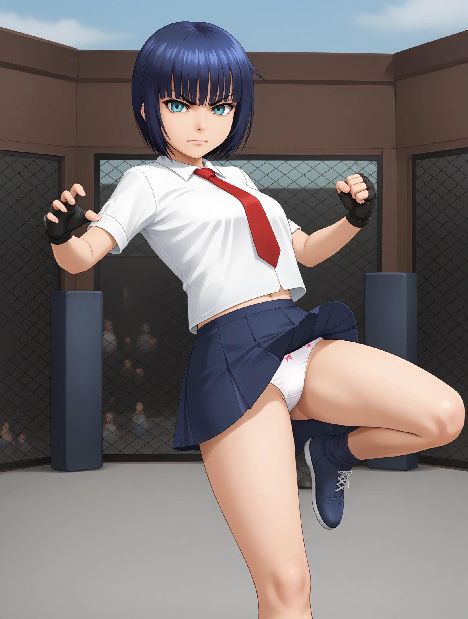 white shirt, red necktie, blue skirt, fingerless gloves