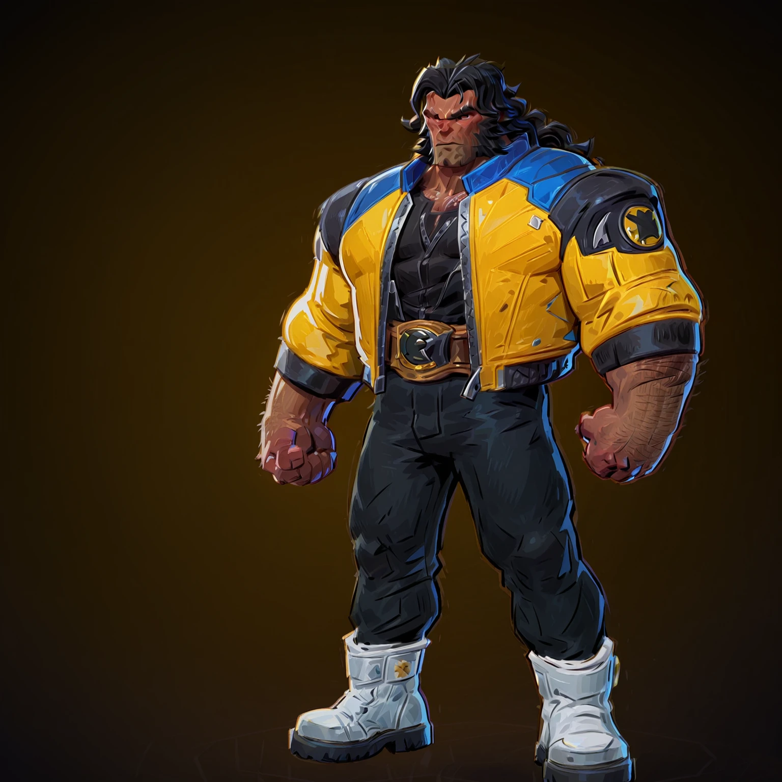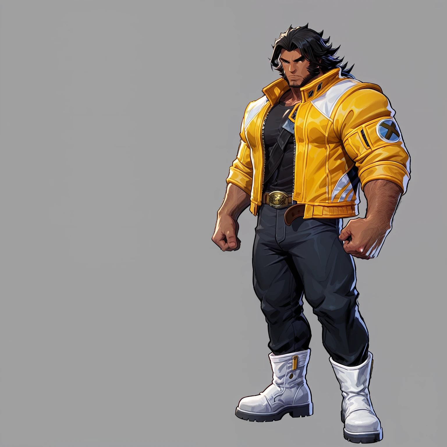 Wolverine Default, 1boy, male focus, solo, yellow jacket, jacket, black hair, black pants, belt, boots, dark-skinned male, facial hair, dark skin, muscular, arm hair, muscular male, , long hair, , white footwear, black shirt