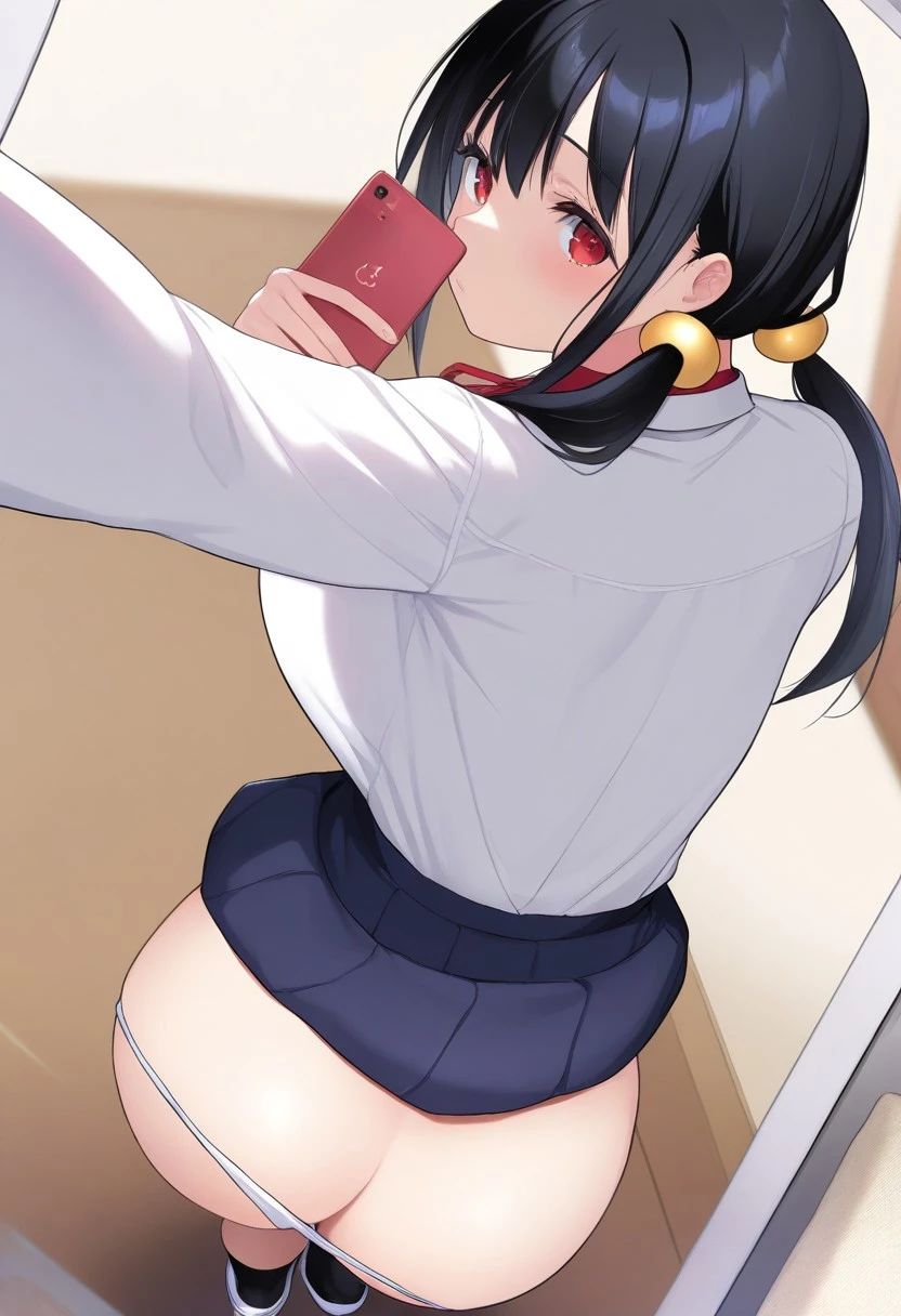 1girl, solo, red eyes, yellow low pigtail circular hair ties,, schoolgirl outfit, , , long black hair, slim waist, medium breasts, low pigtails,