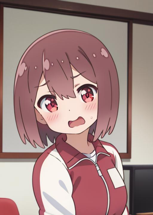hoshino miyako, hair over one eye, brown hair, red eyes, short hair, large breasts