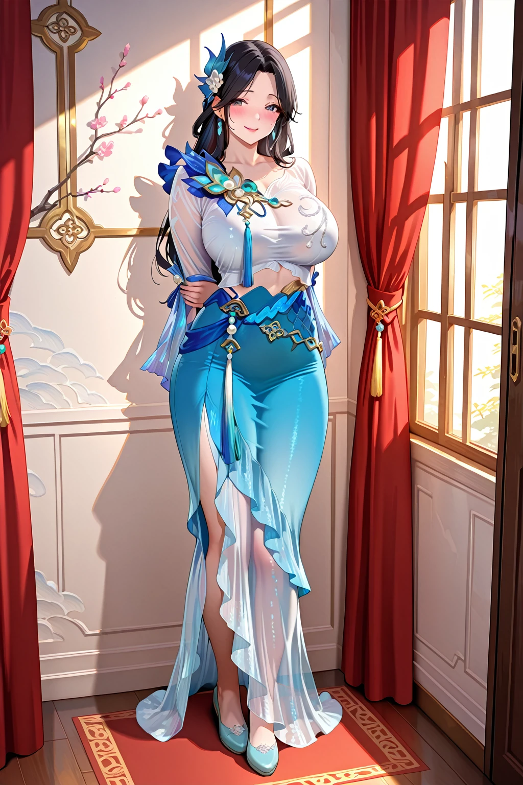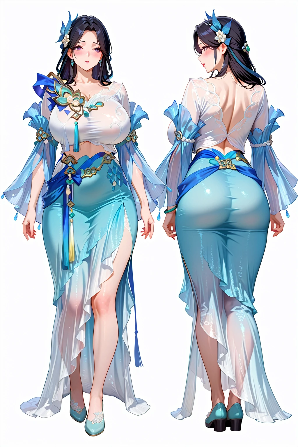 chinese-style wedge shoes,dress,fish scales decoration,gradient ,jewelry,long sleeves,multi-layer tulle skirt,
