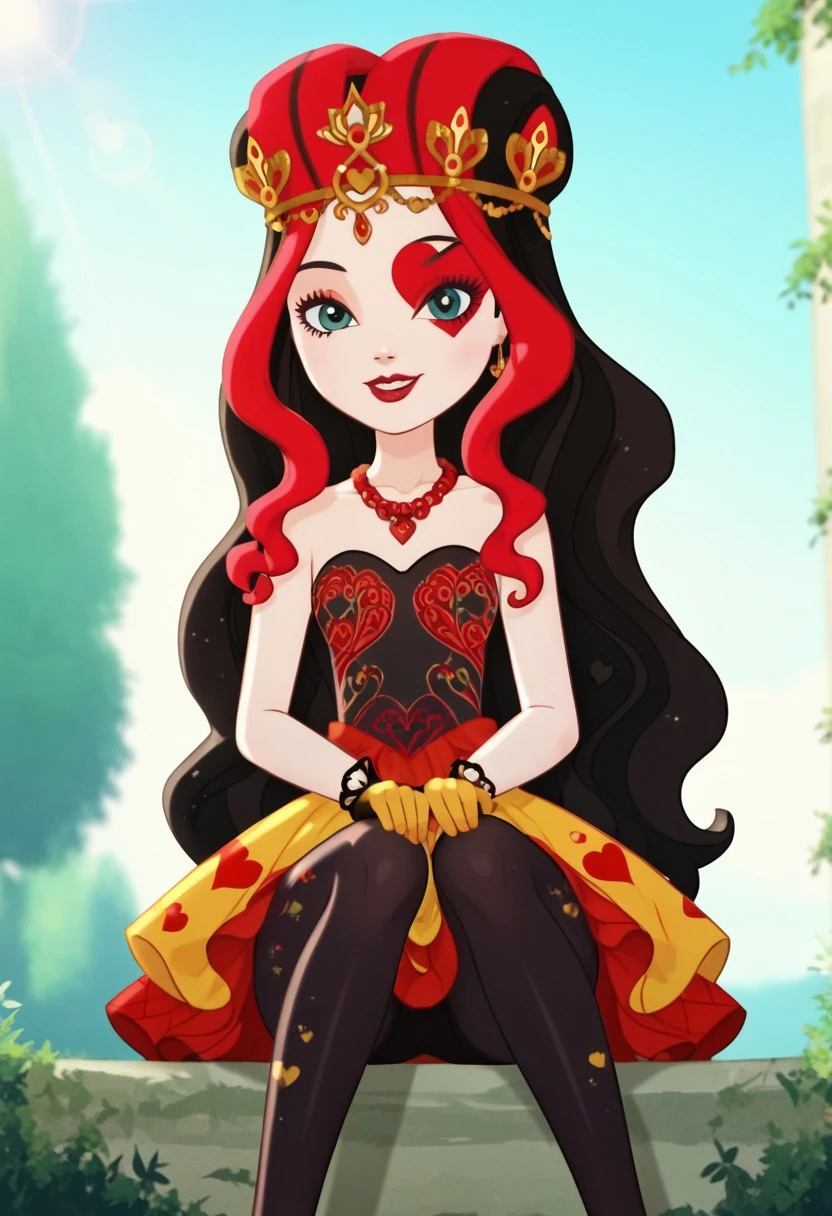 Trigger words: princess of hearts, wonderland, white skin, red heart mark on right eye, blue-green eyes, black hair with red highlights, yellow tiara, red and black gloves, red necklace, red, black and yellow clothes, black tights with heart, red, black and yellow shoes, holding playing cards