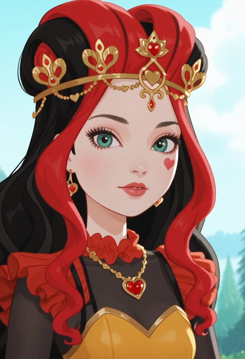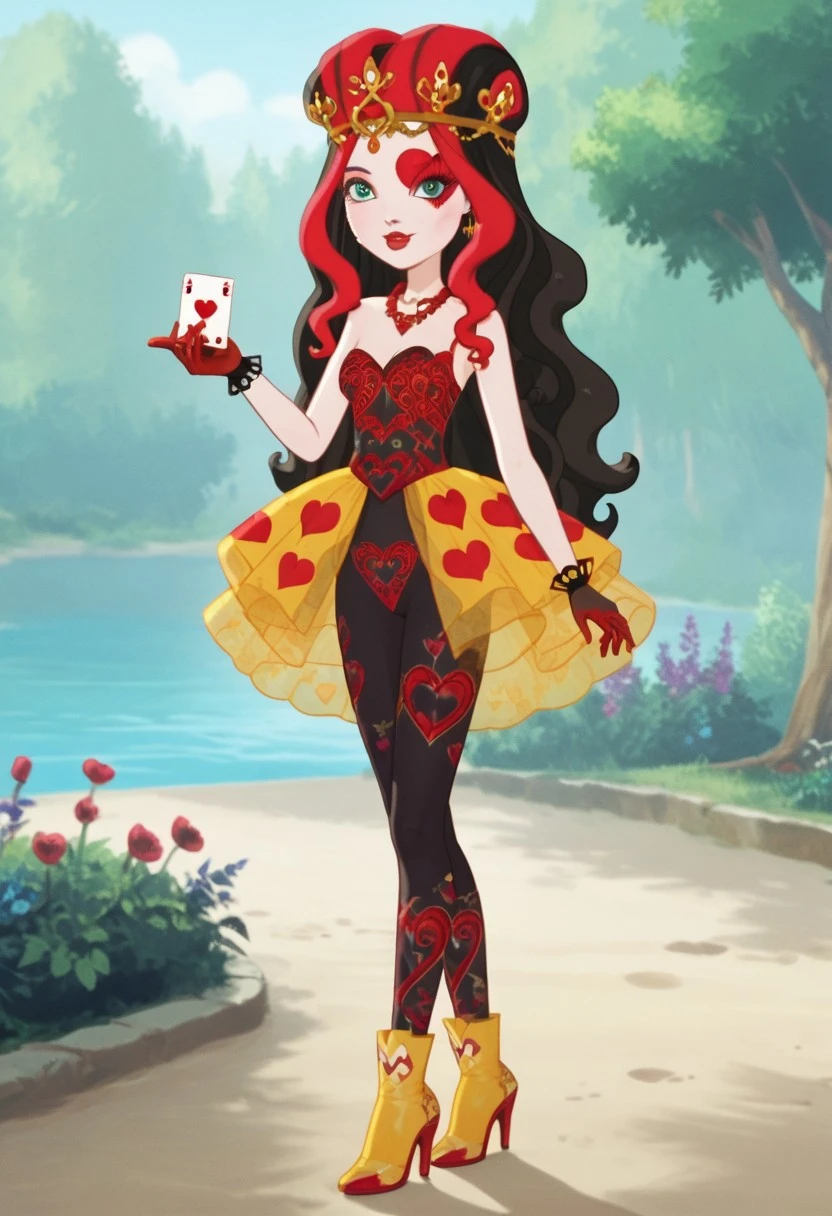 princess of hearts, wonderland, white skin, red heart mark on right eye, blue-green eyes, black hair with red highlights, yellow tiara, red and black gloves, red necklace, red, black and yellow clothes, black tights with heart, red, black and yellow shoes, holding playing cards
