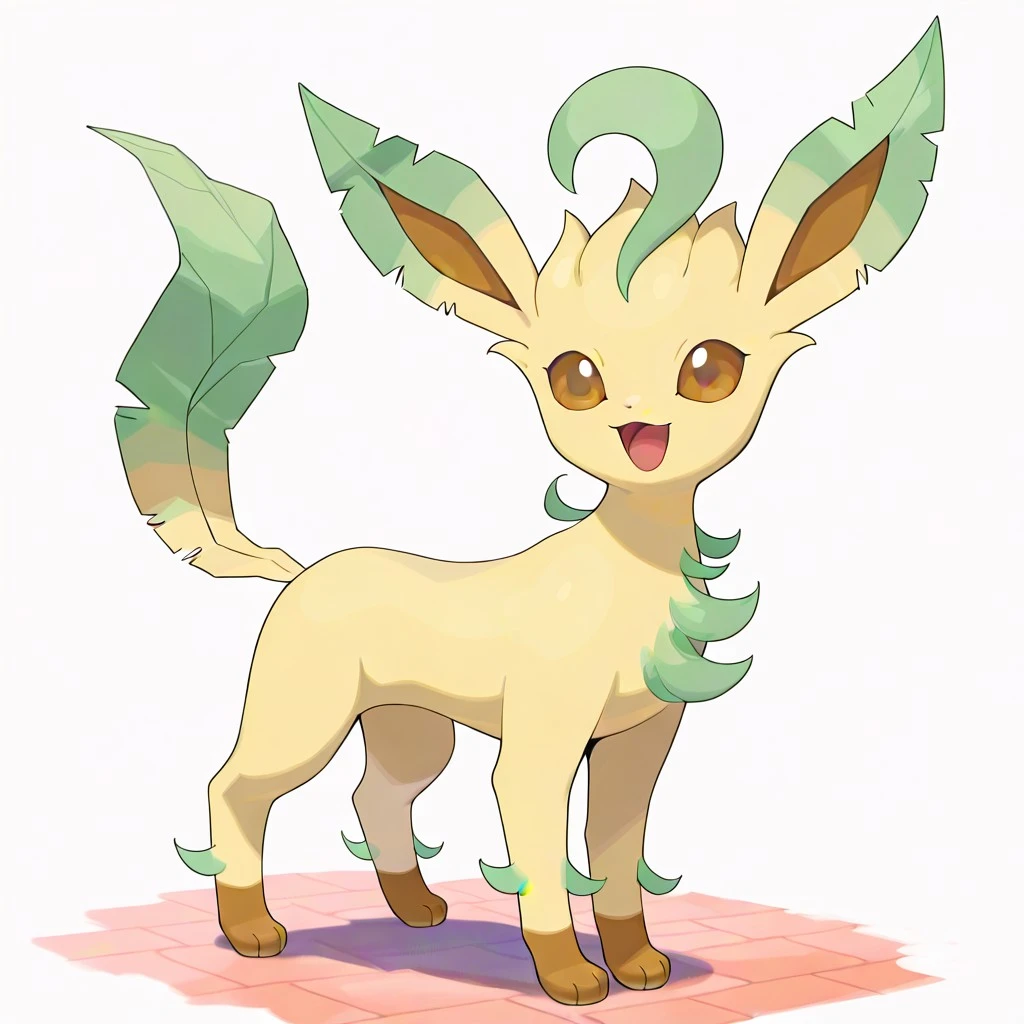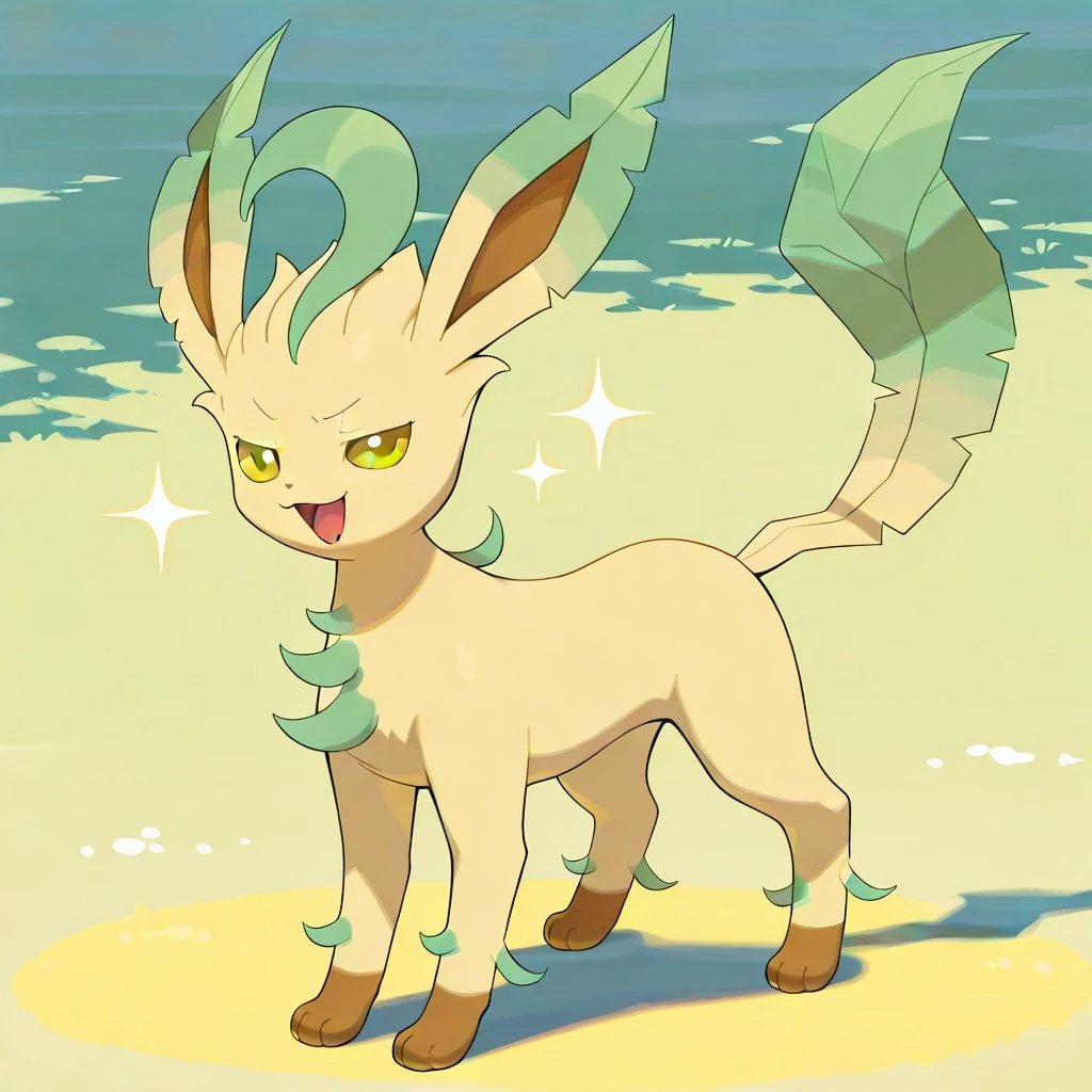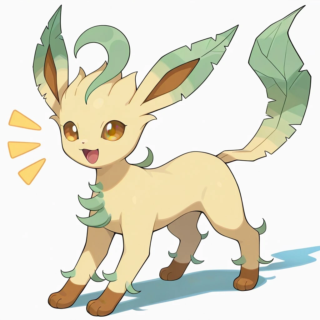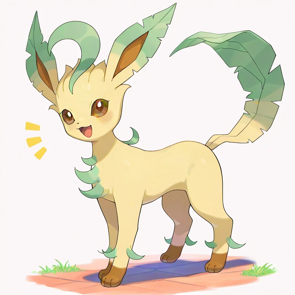 leafeon, pokemon (creature), quadruped, light yellow fur, brown paws, brown eyes, green markings