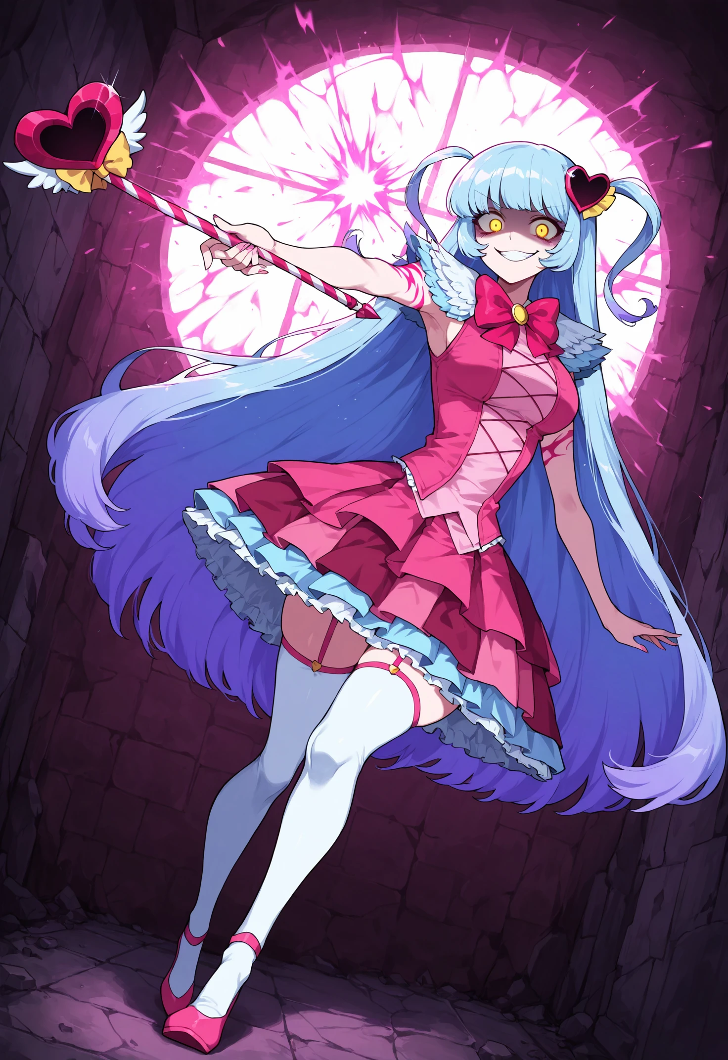magical girl, pink dress, sleeveless dress, frills, white stockings, pink garters, pink shoes