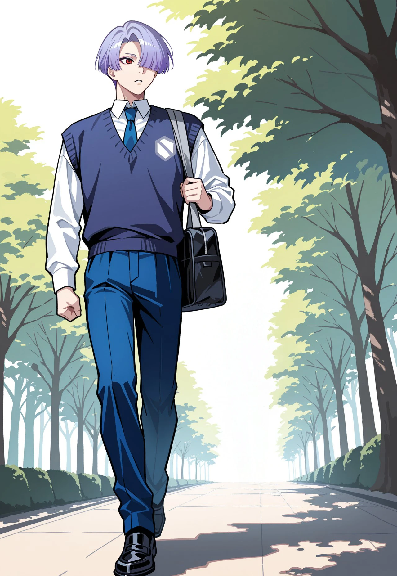 SUPEST, official alternate costume, layered clothes, white collared shirt, long sleeves, blue necktie, blue sweater vest, blue dress pants, black shoes