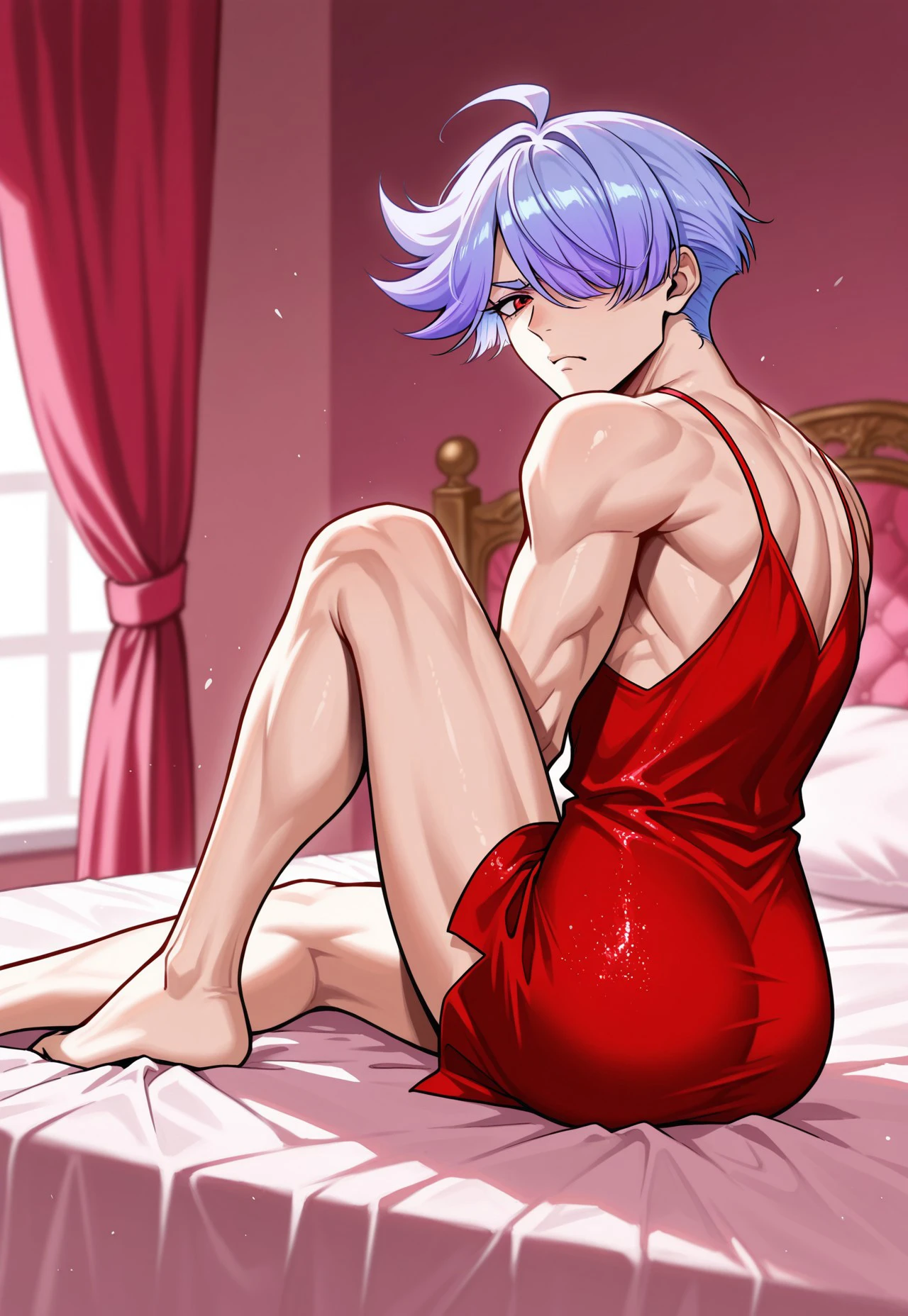 NPSWGPEST, 1boy, red eyes, short hair, purple hair, gradient hair, one eye covered, official alternate hairstyle, parted bangs, swept bangs, ahoge, PCPEST, official alternate costume, red short dress, sleeveless dress, red high heels,
