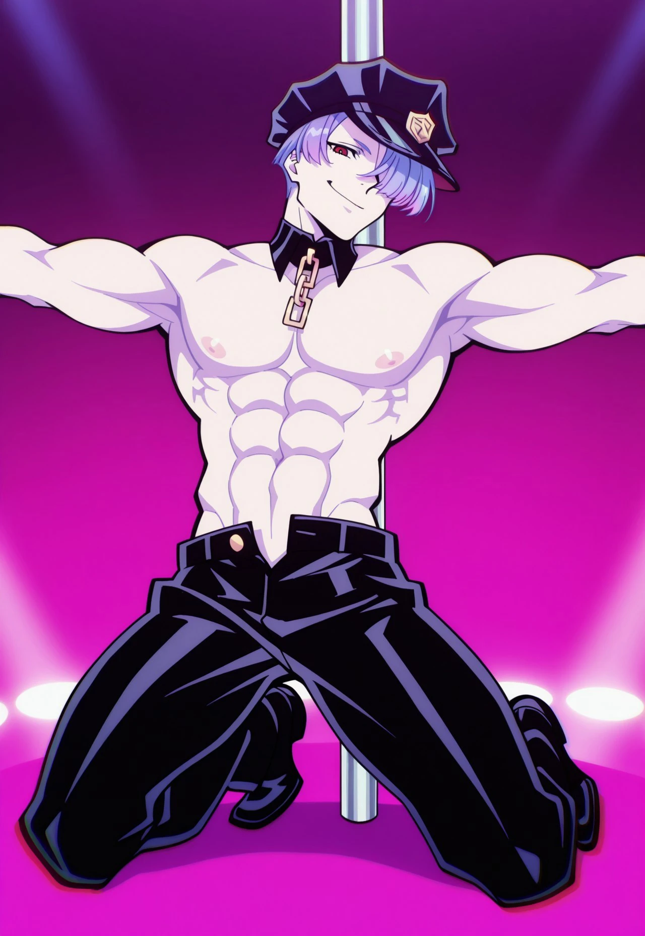 TFPEST, official alternate costume, black peaked cap, detached collar, topless male, black half gloves, black pants, open fly, black shoes,