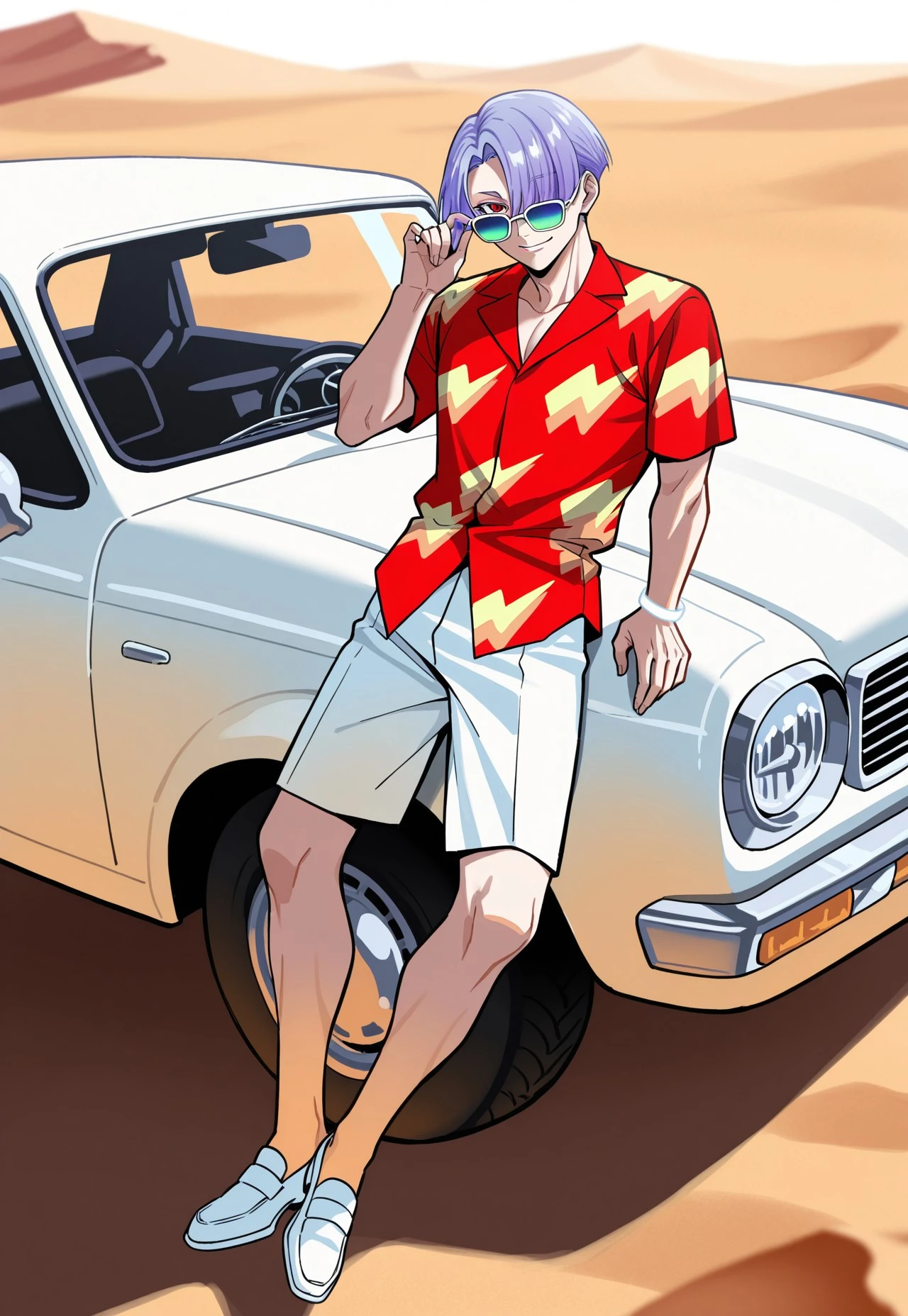 RTPEST, official alternate costume, eyewear on head, sunglasses, gradient-tinted eyewear, white bracelet, red hawaiian shirt, lightning bolt print, untucked shirt, white shorts, white loafers