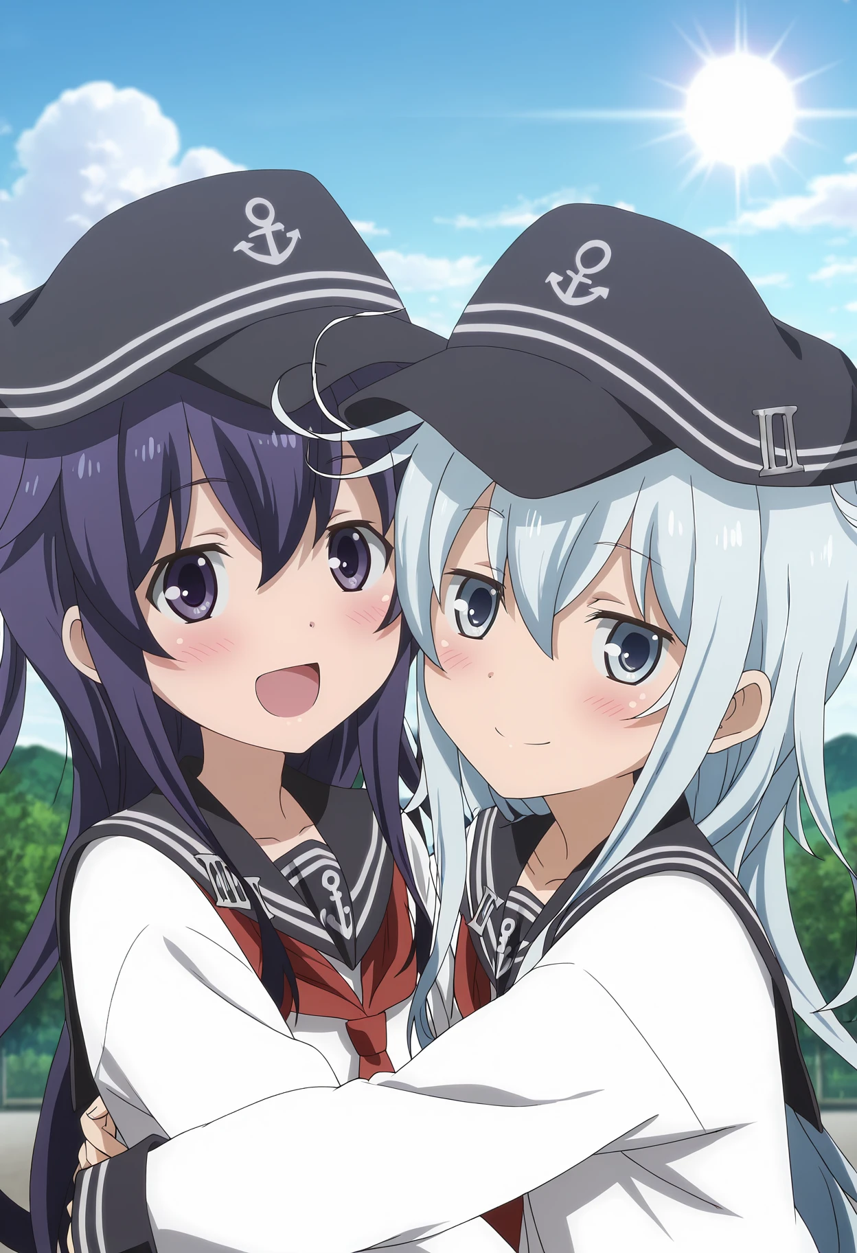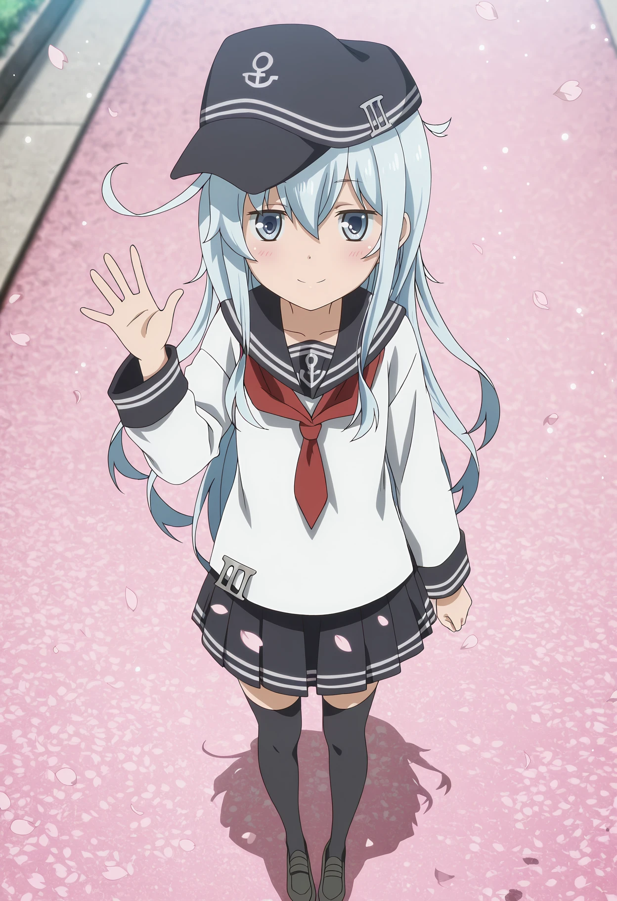 School: hibiki (character), serafuku (outfit), 1girl, light blue eyes, light blue hair, long hair, black cap, serafuku, black collar, white trim, red necktie, long sleeves, black skirt, pleated skirt, black thighhighs, shoes