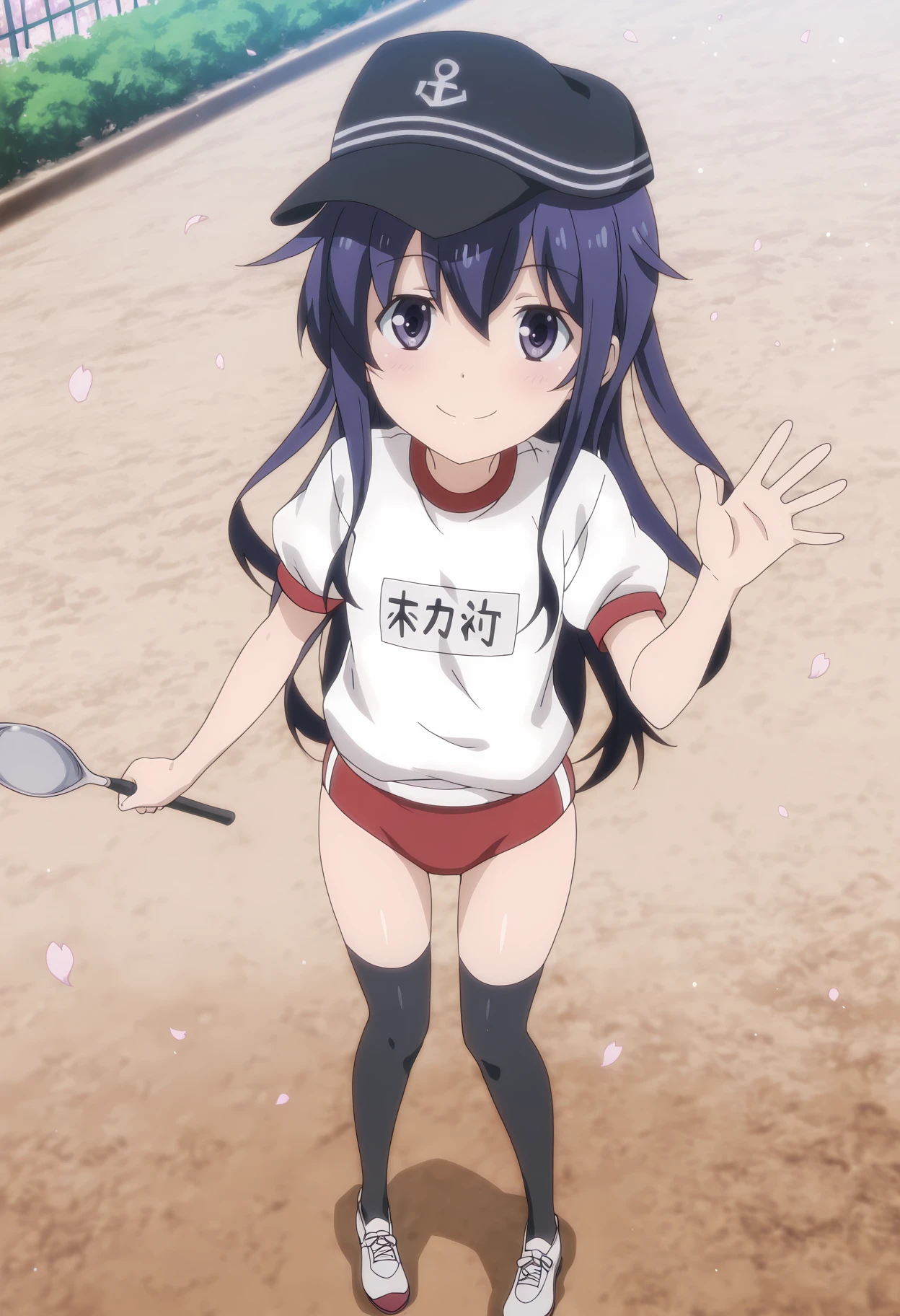 Gym: akatsuki (character), gym_uniform (outfit), 1girl, dark blue eyes, dark blue hair, long hair, black cap, gym uniform, white shirt, name tag, short sleeves, red buruma, black thighhighs, sneakers