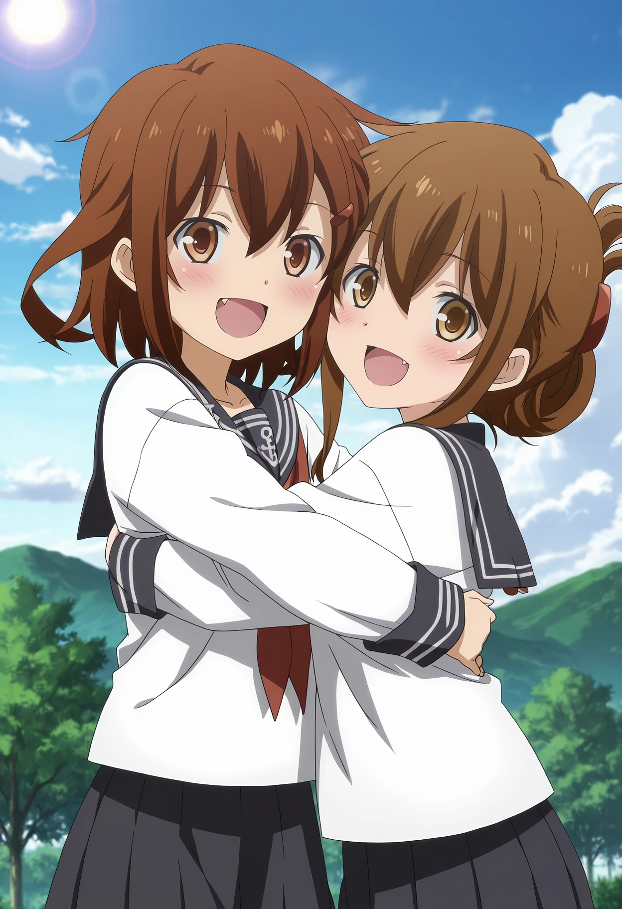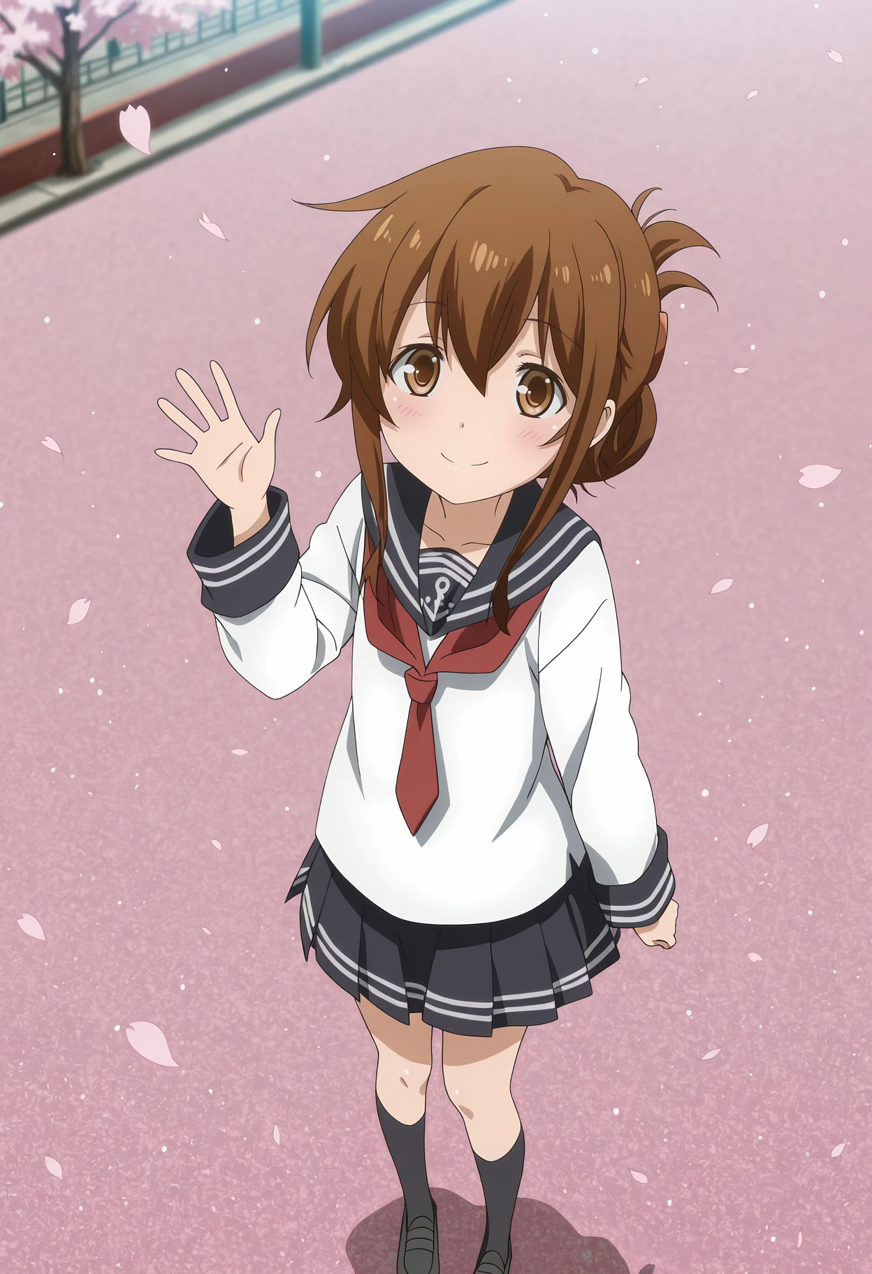 School: inazuma (character), serafuku (outfit), 1girl, light brown eyes, light brown hair, updo hair, long hair, serafuku, black collar, white trim, red necktie, long sleeves, black skirt, pleated skirt, black socks, shoes