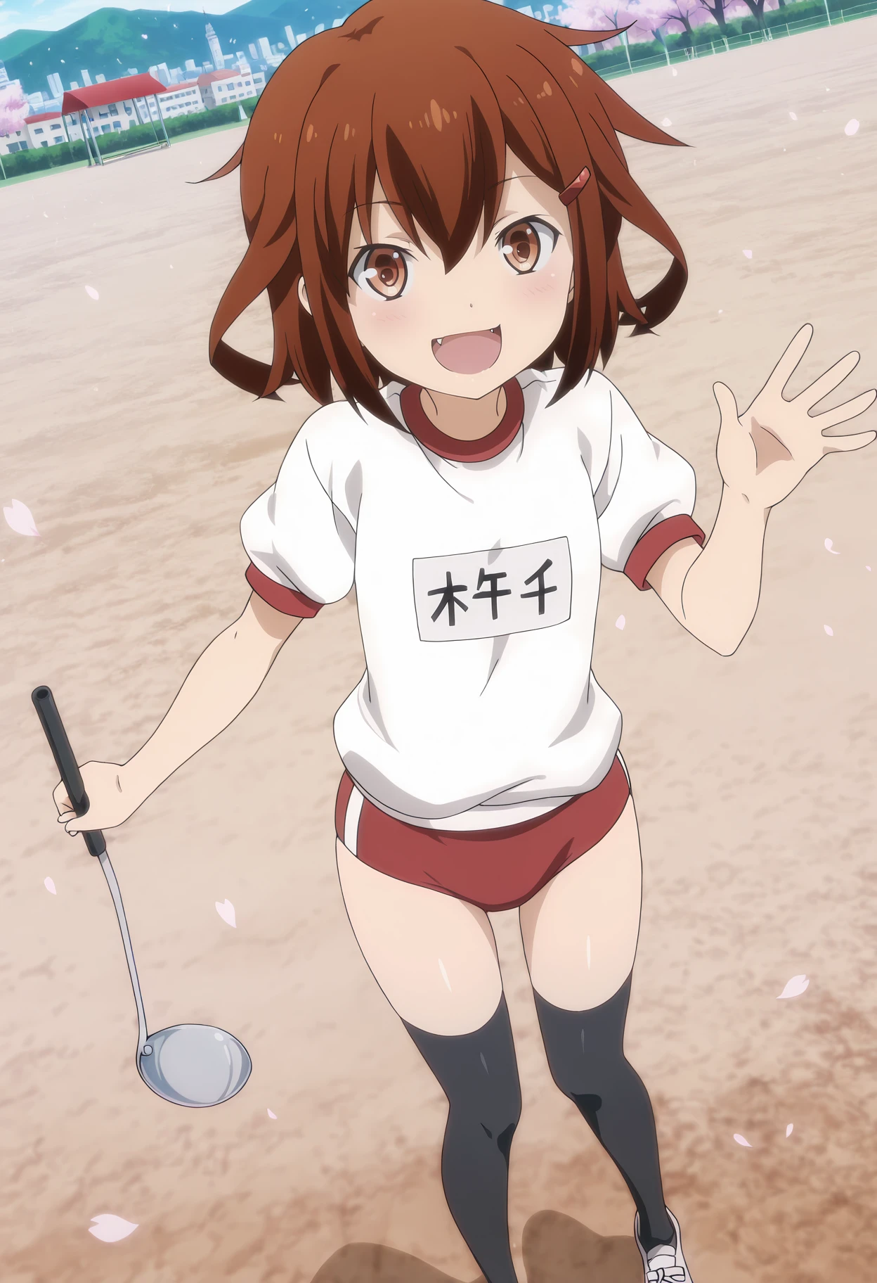 Gym: ikazuchi (character), gym_uniform (outfit), 1girl, dark brown eyes, dark brown hair, short hair, hairclip, fang, gym uniform, white shirt, name tag, short sleeves, red buruma, black thighhighs, sneakers
