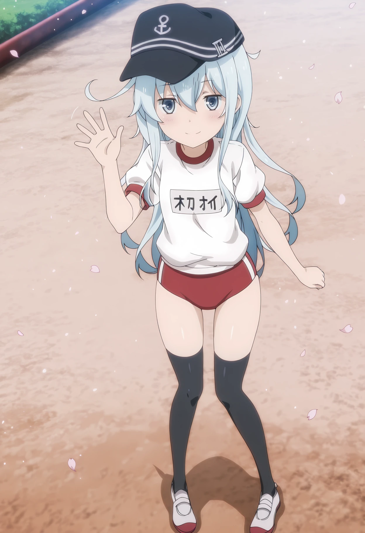 Gym: hibiki (character), gym_uniform (outfit), 1girl, light blue eyes, light blue hair, long hair, black cap, gym uniform, white shirt, name tag, short sleeves, red buruma, black thighhighs, sneakers