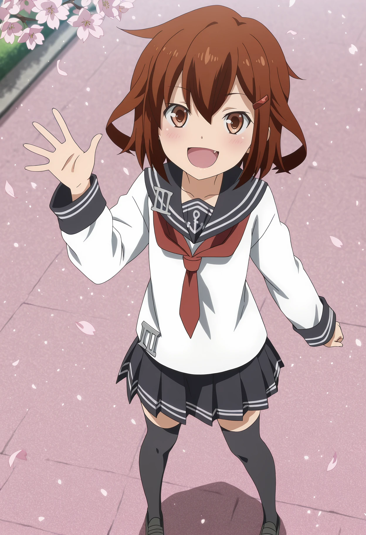 School: ikazuchi (character), serafuku (outfit), 1girl, dark brown eyes, dark brown hair, short hair, hairclip, fang, serafuku, black collar, white trim, red necktie, long sleeves, black skirt, pleated skirt, black thighhighs, shoes