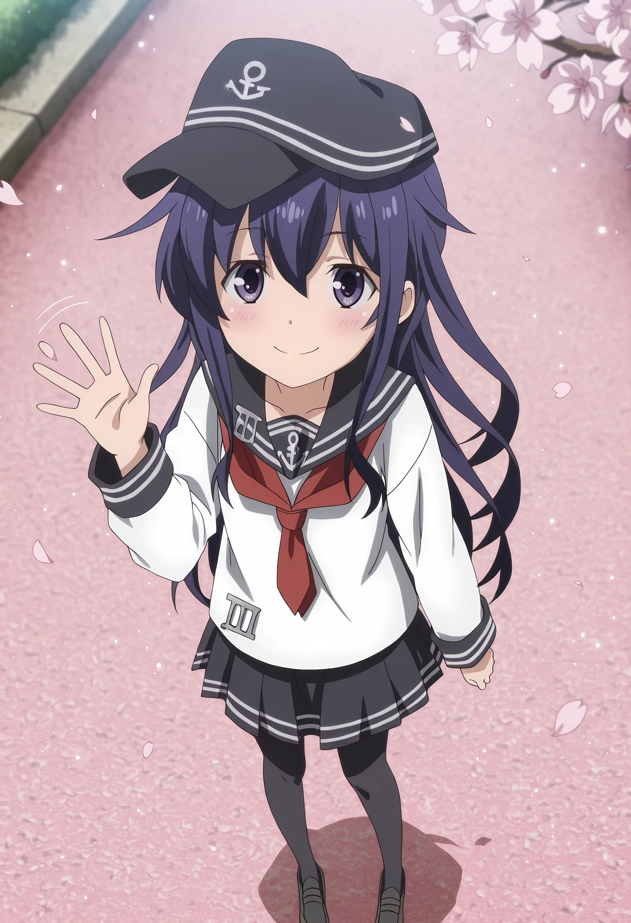 School: akatsuki (character), serafuku (outfit), 1girl, dark blue eyes, dark blue hair, long hair, black cap, serafuku, black collar, white trim, red necktie, long sleeves, black skirt, pleated skirt, black pantyhose, shoes