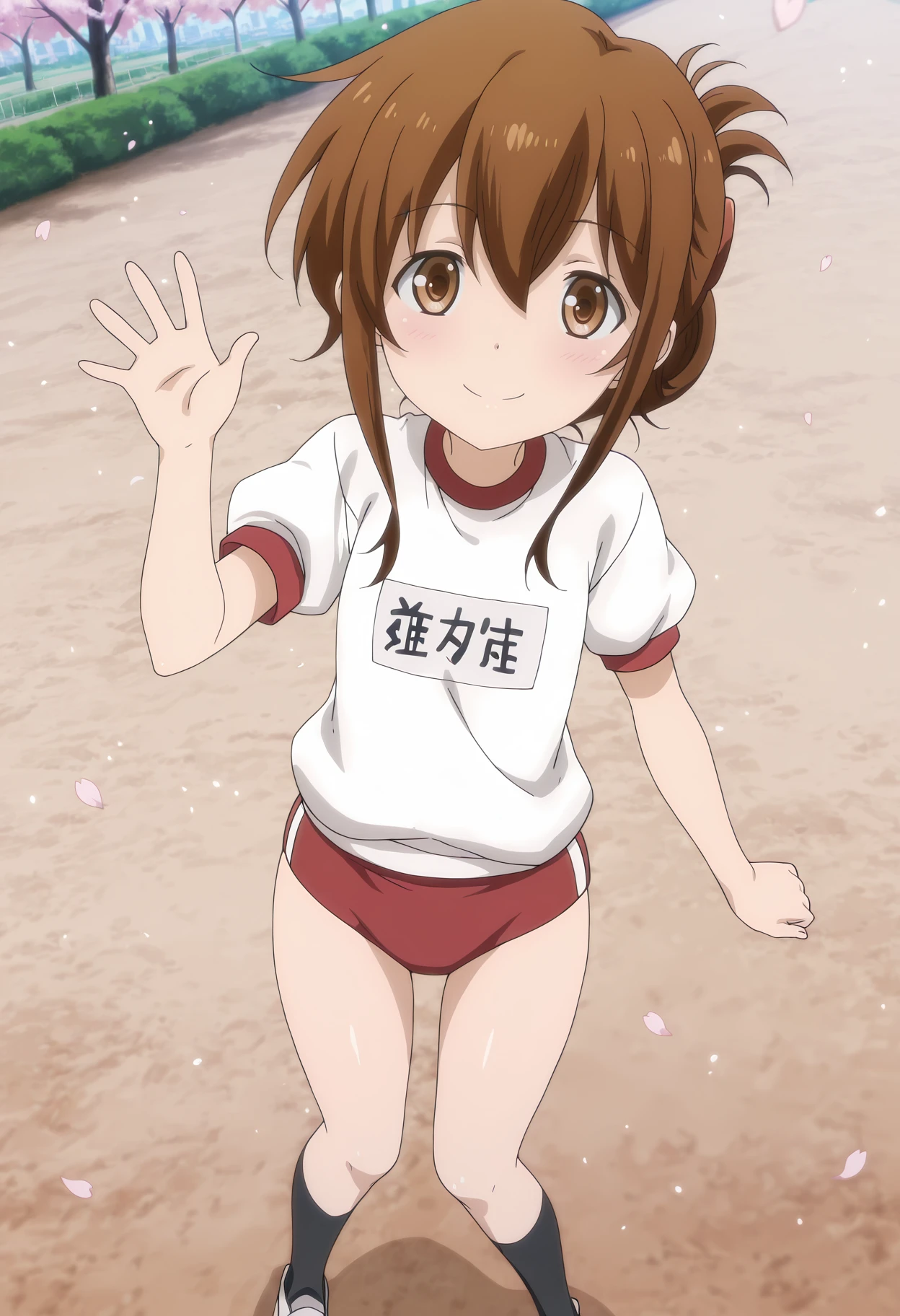 Gym: inazuma (character), gym_uniform (outfit), 1girl, light brown eyes, light brown hair, updo hair, long hair, gym uniform, white shirt, name tag, short sleeves, red buruma, black socks, sneakers