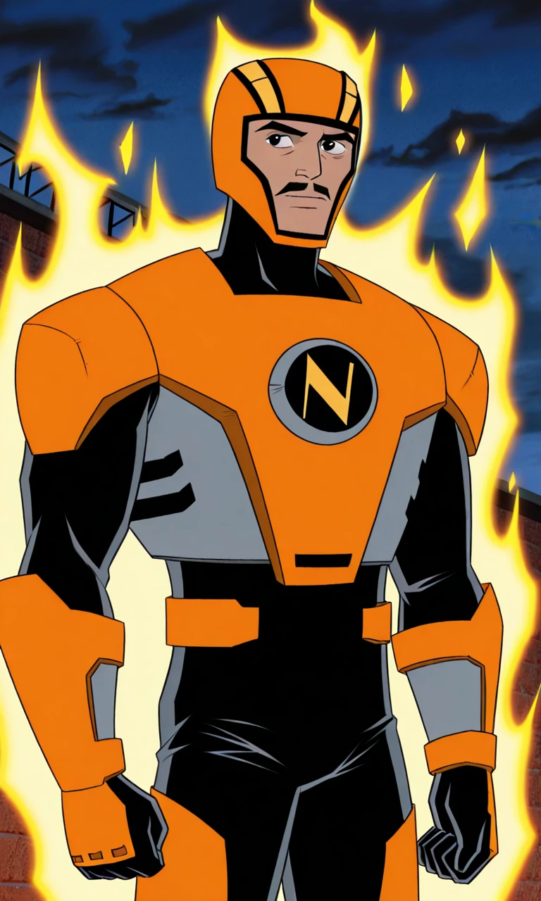 Captain_n,1boy,solo,orange helmet,Black eyes,mustache,orange and grey bodysuit,armor,black spandex,superhero,orange gloves