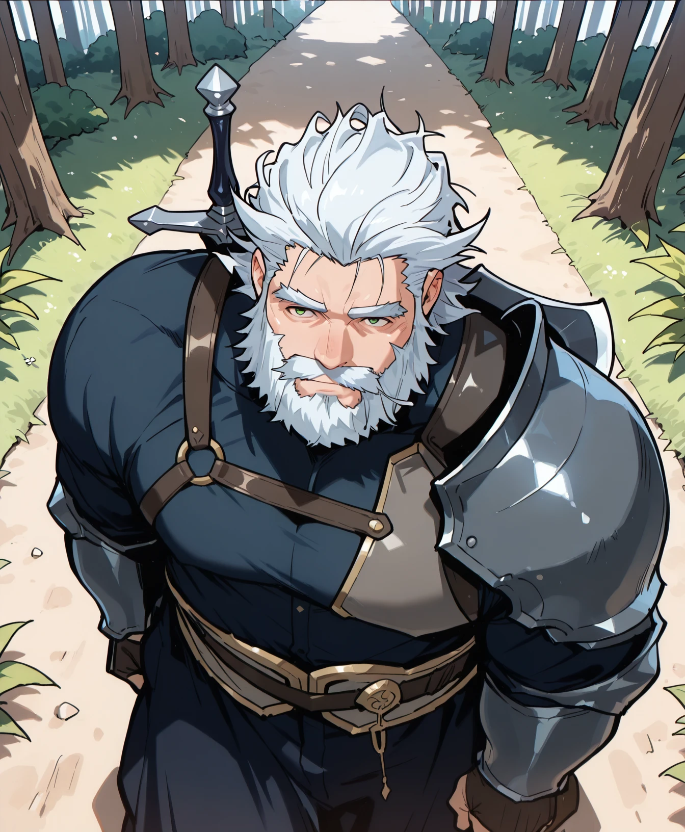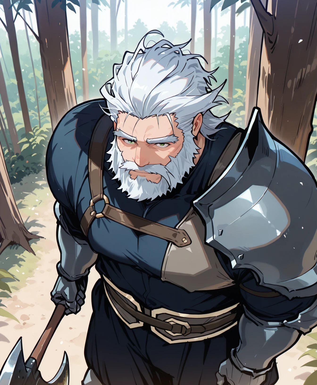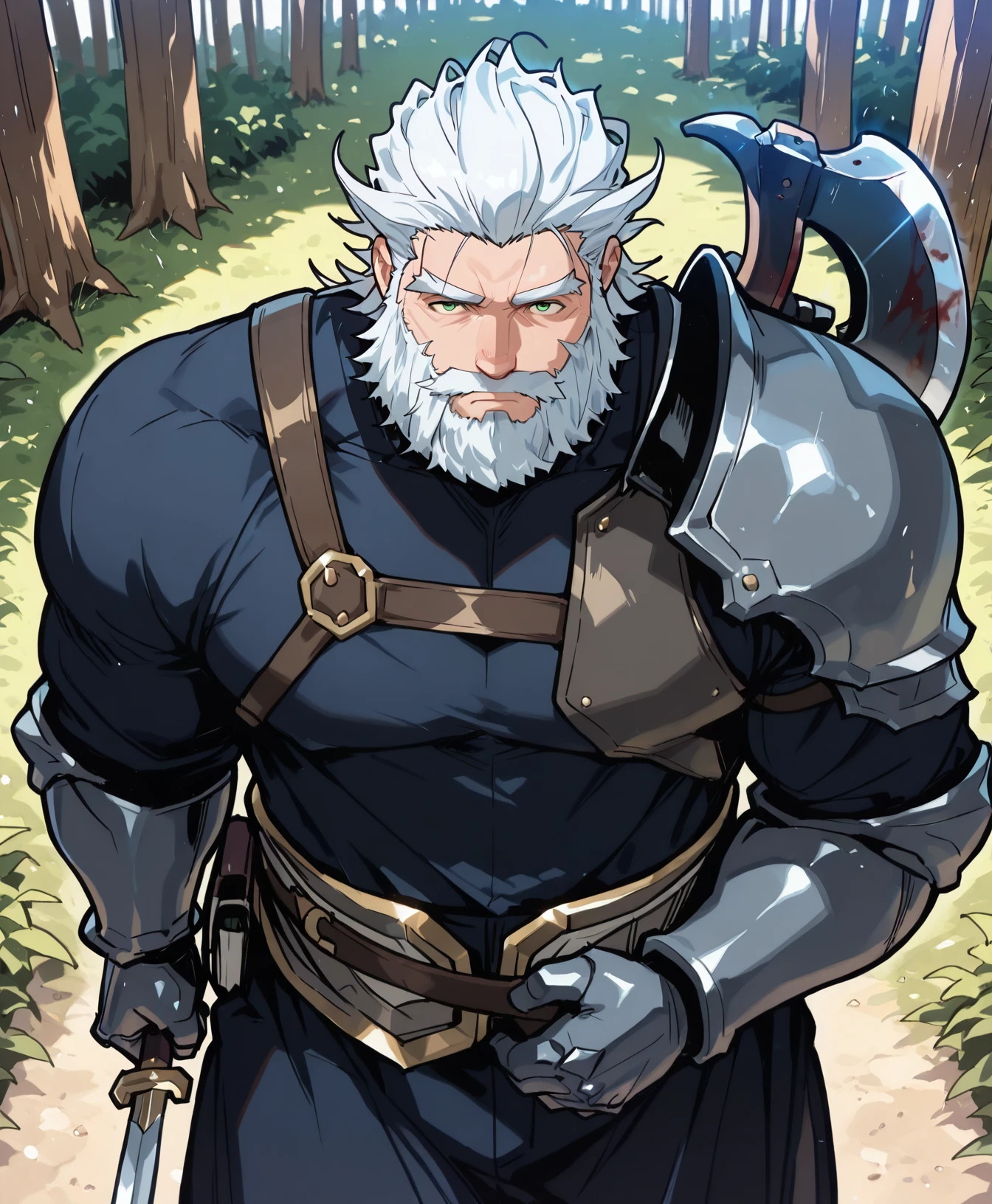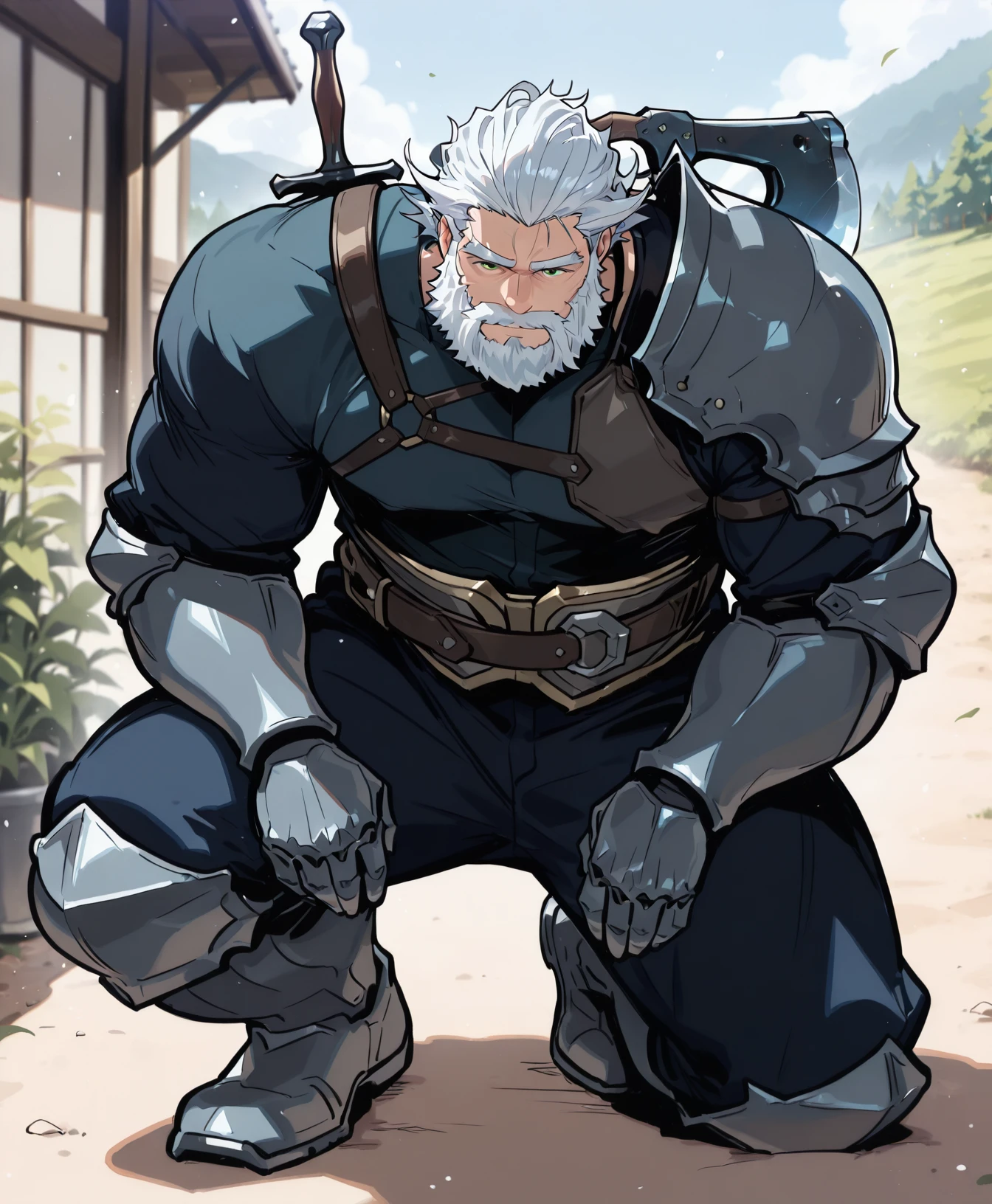 Trigger words are: Gillion,mature man,white beard,white hair,tiny green eyes,mustash,bara,large shoulders,large pectorals,