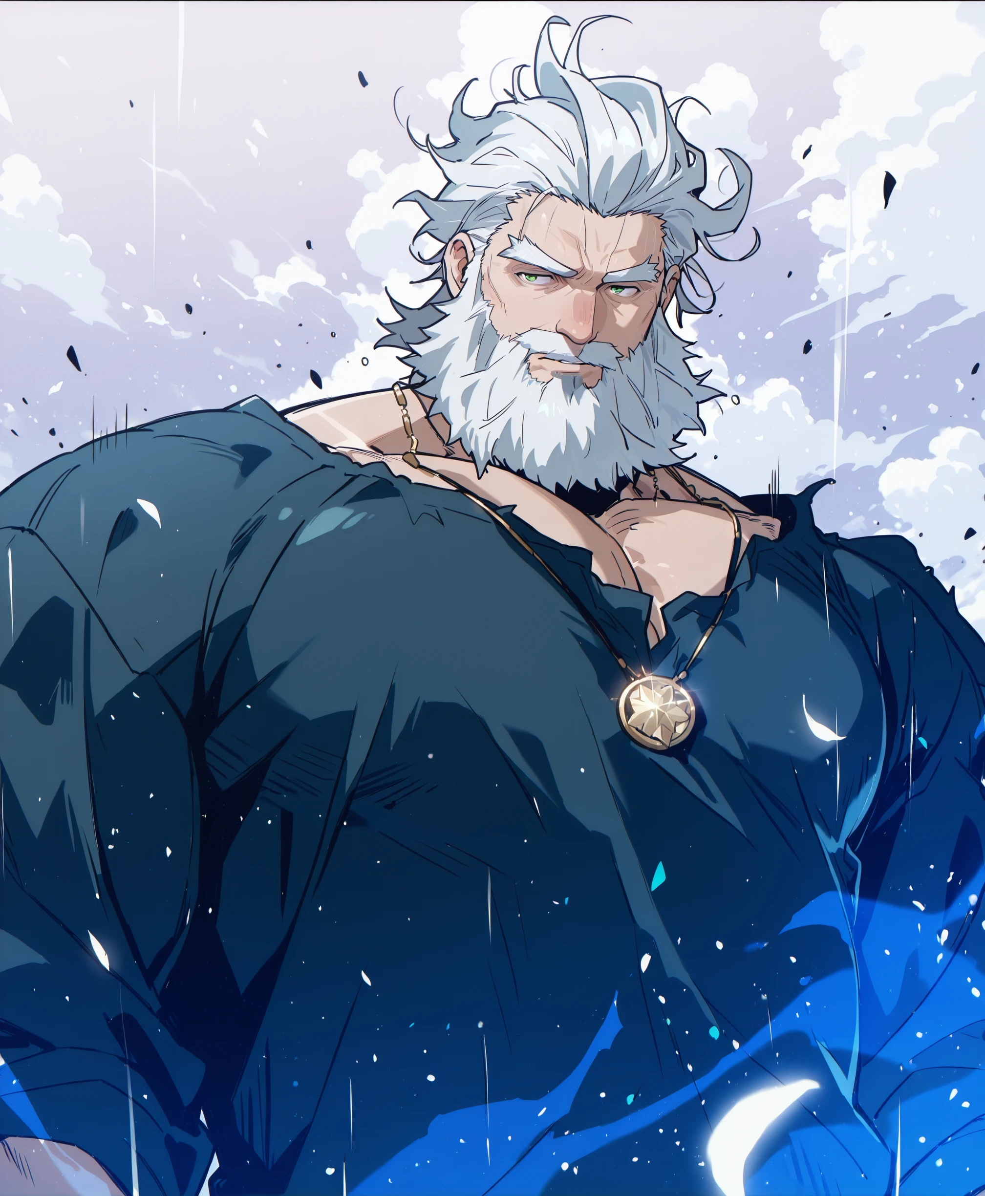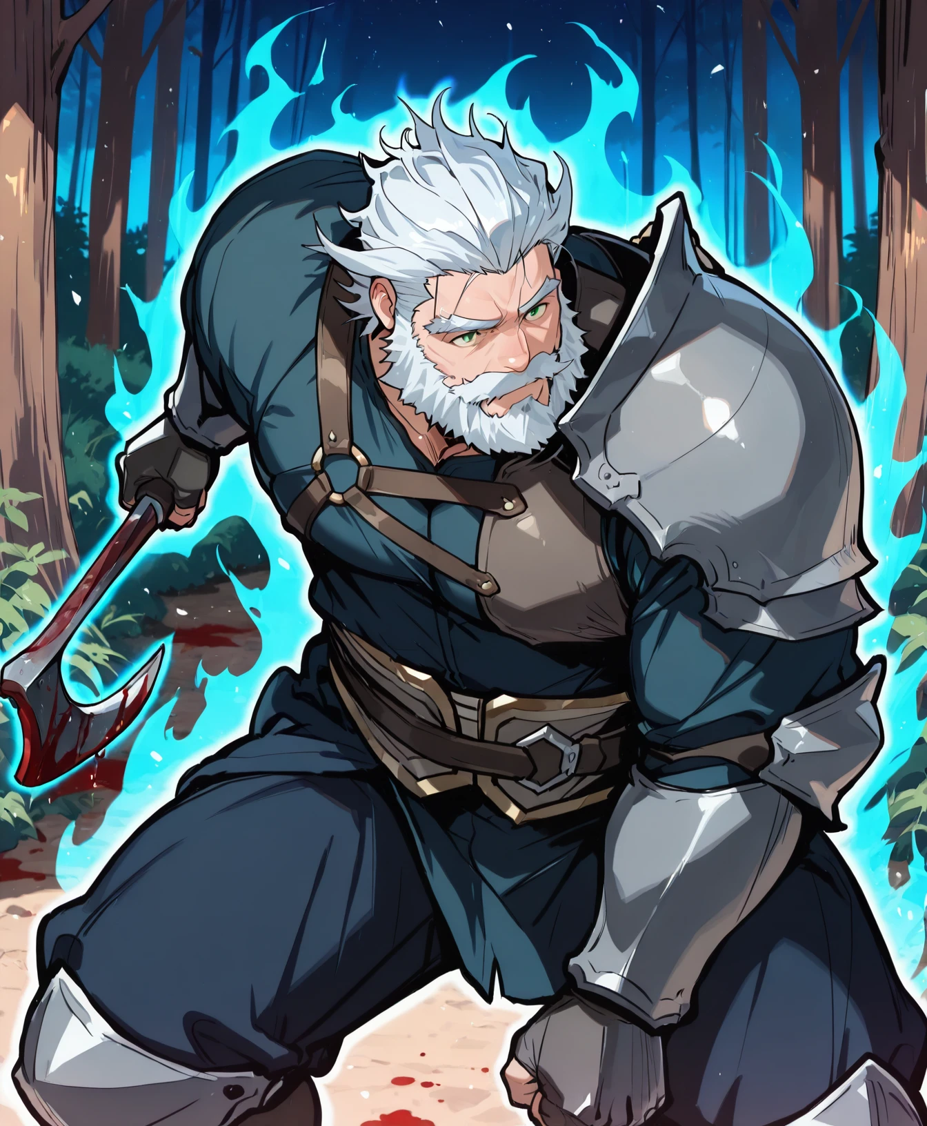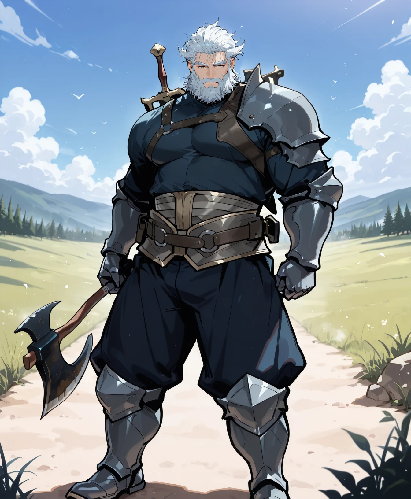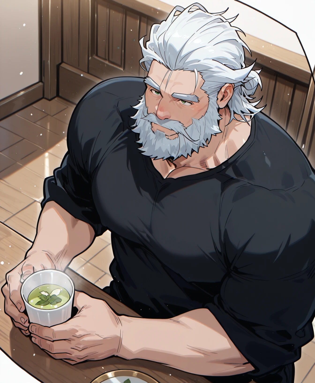 Trigger words are: Gillion,mature man,white beard,white hair,tiny green eyes,mustash,bara,large shoulders,large pectorals,