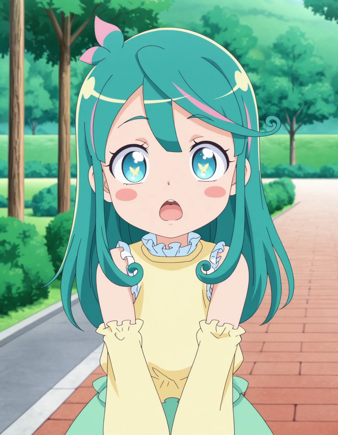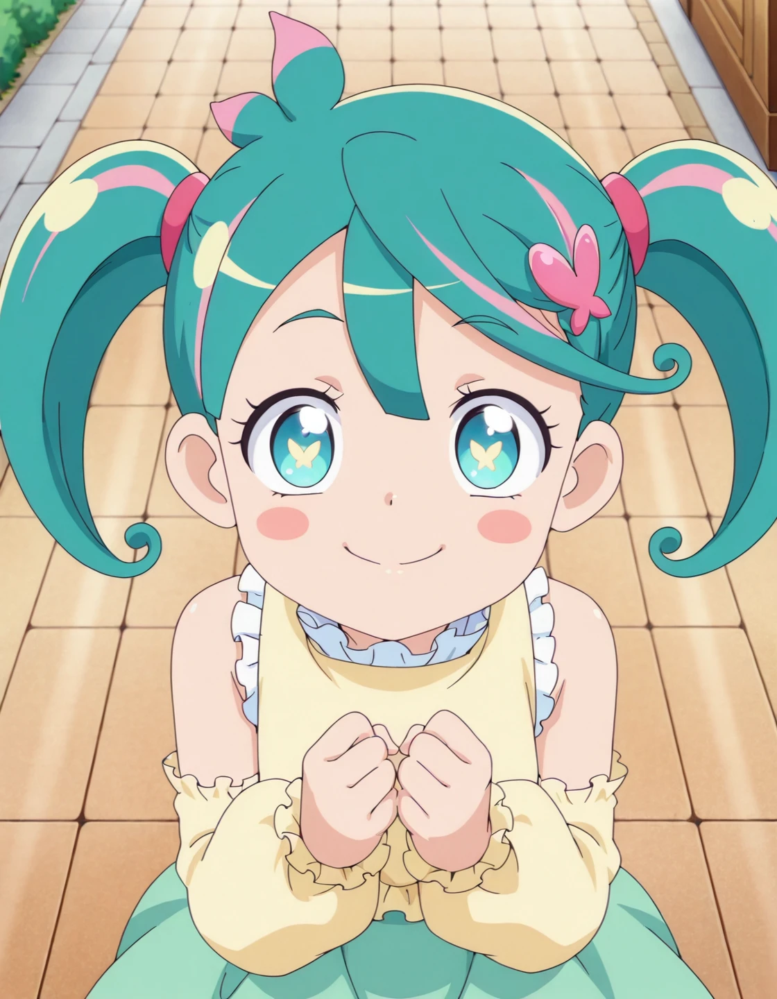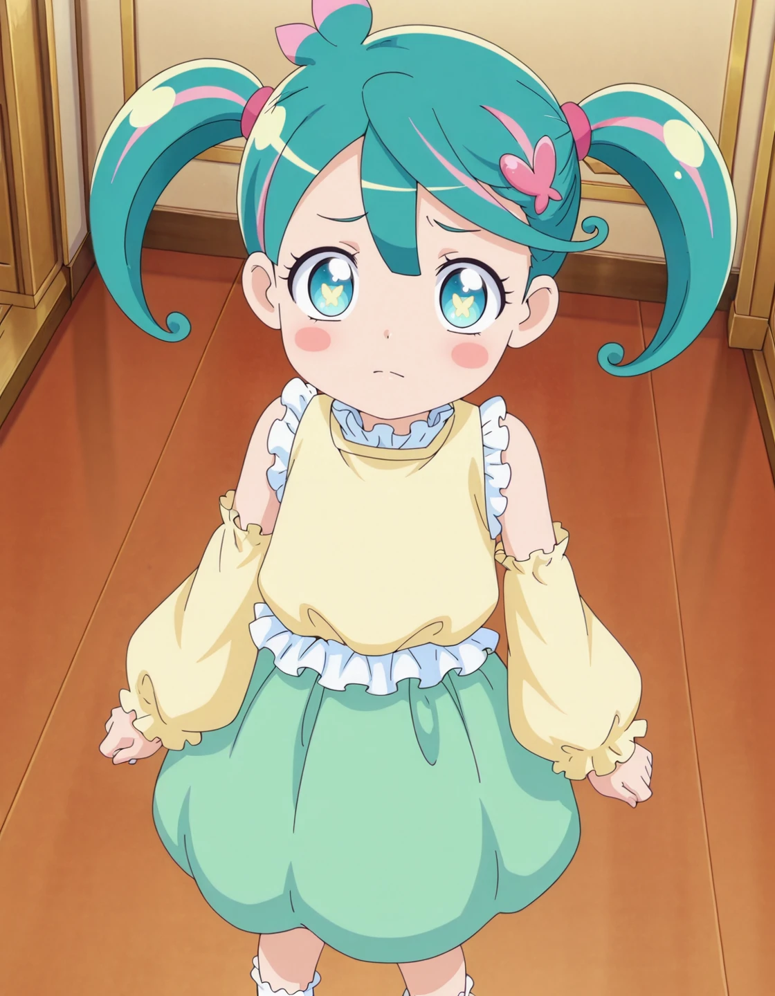 score_9, score_8_up, score_7_up, anime screencap, solo,1girl,hisui, shirt, twintails, detached sleeves, sleeveless, blush stickers, skirt, yellow shirt, socks, hair ornament, green skirt <lora:hisui_pony:0.8>