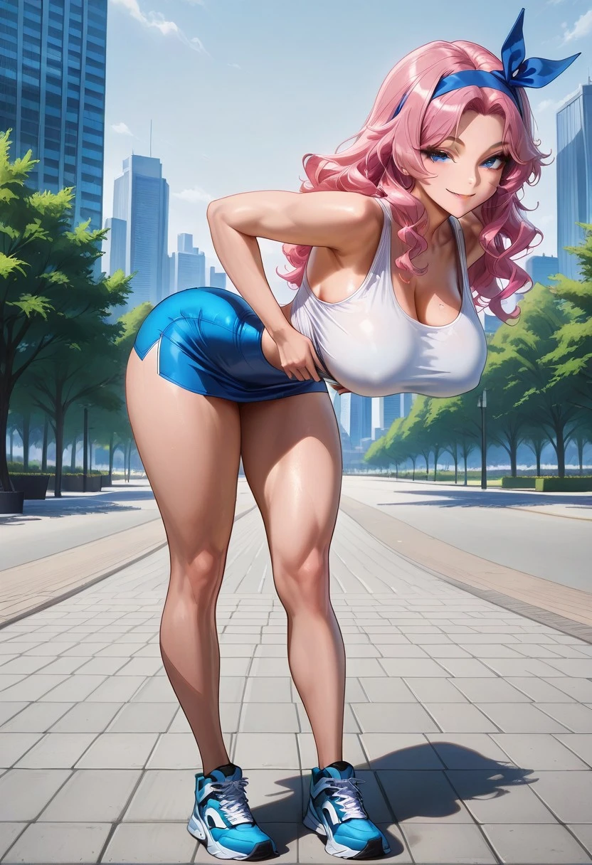 Patty, long wavy pink hair, parted bangs, blue eyes, blue hairband, thin, fit body