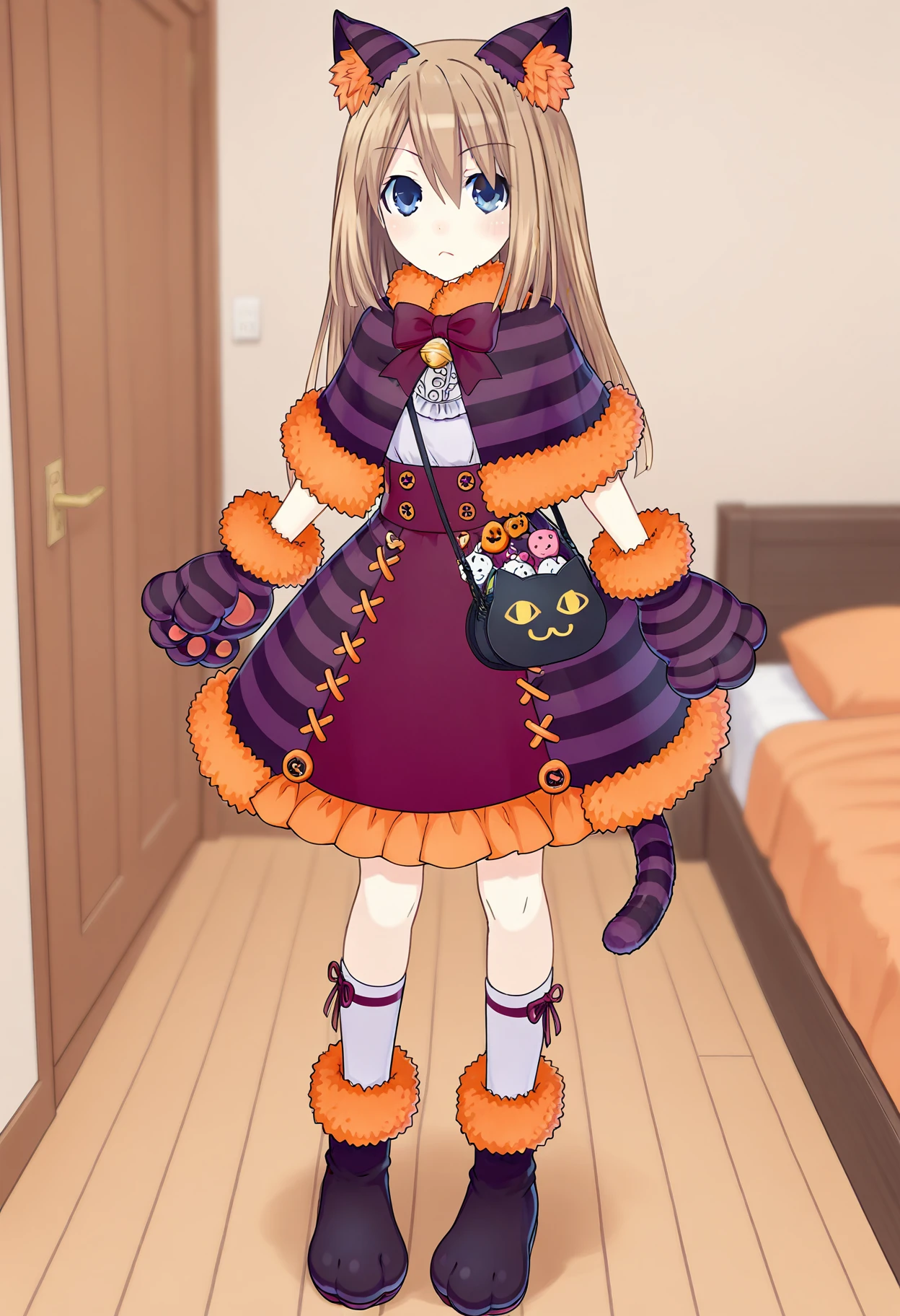万圣节服装:ram halloween,1girl,solo,bell,cat ears,capelet,cat paws,paw gloves,socks,paw shoes,cat tail,cat bag,halloween costume,halloween dress,