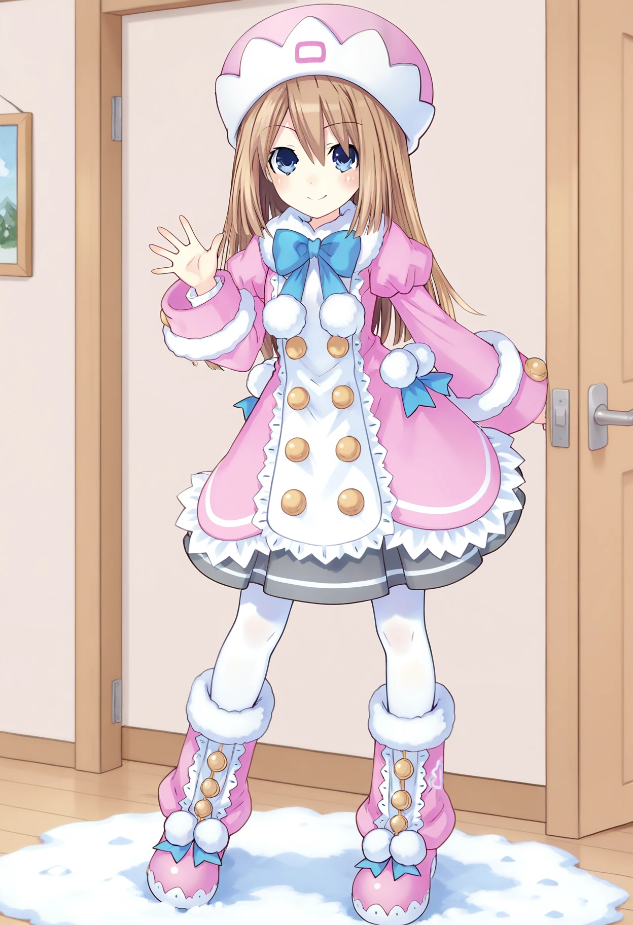 日常:ram daily,1girl,solo,pink hat,pink coat,grey skirt,long sleeves,white pantyhose,pink snow boots,blue shoulder bag,blue bow,