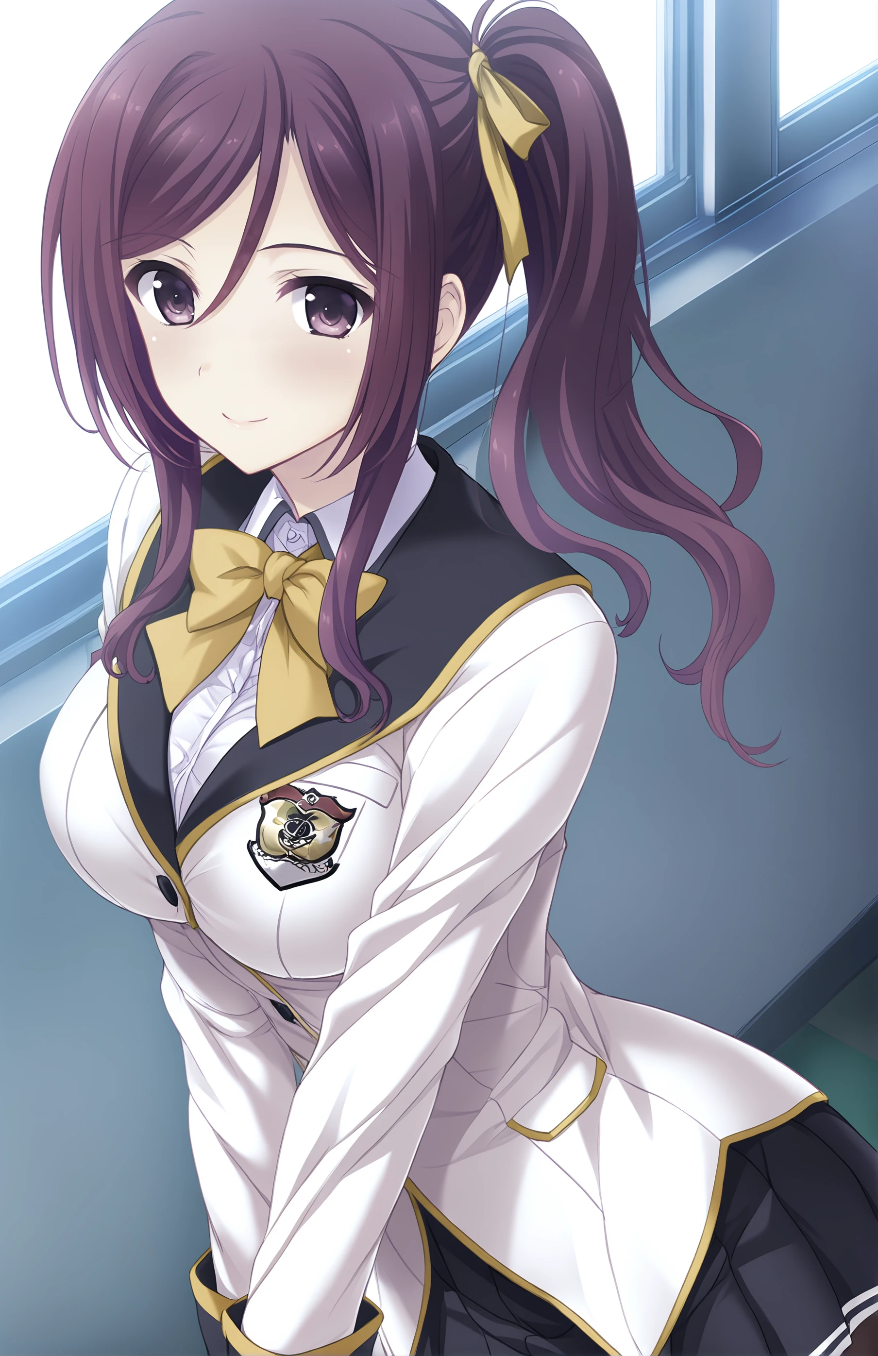 NarukamiChizuru, long hair, breasts, bangs, skirt, large breasts, brown hair, shirt, long sleeves, bow, ribbon, hair between eyes, brown eyes, purple eyes, school uniform, jacket, hair ribbon, white shirt, purple hair, pantyhose, sidelocks, pleated skirt, collared shirt, bowtie, black skirt, side ponytail,black pantyhose, dress shirt, blazer, white jacket, yellow bow, yellow ribbon