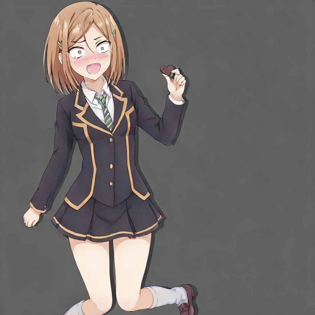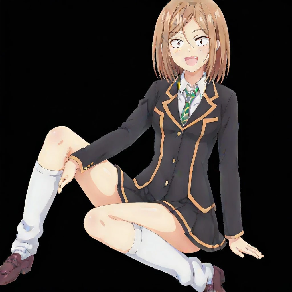 yayoi toba \(ayakashi triangle\), light brown hair, medium hair, hair between eyes, bangs, brown eyes, hairclips, fang, black and gold school uniform, skirt, white undershirt, necktie, collar, socks, heels, large breasts, 1girl, solo