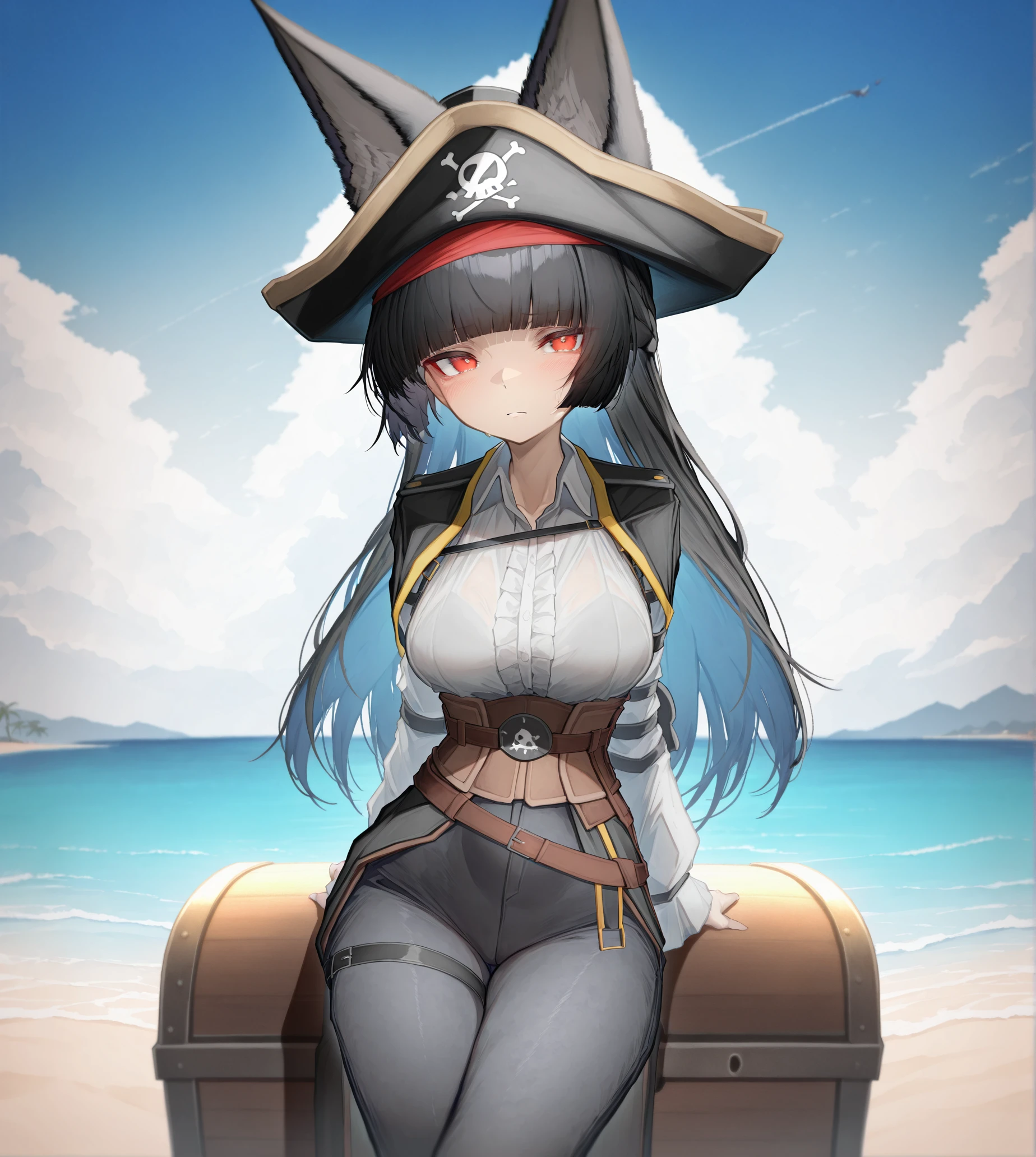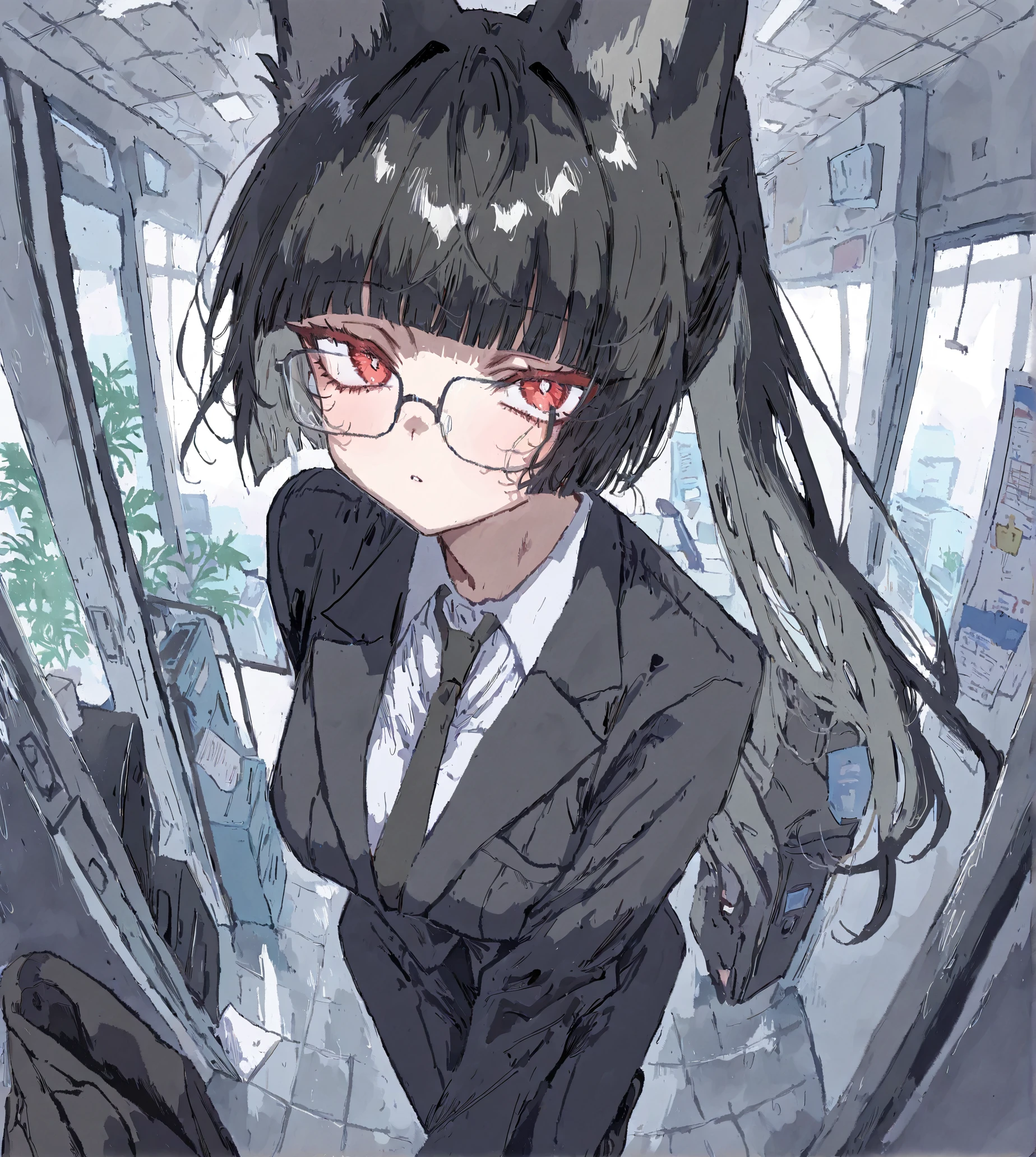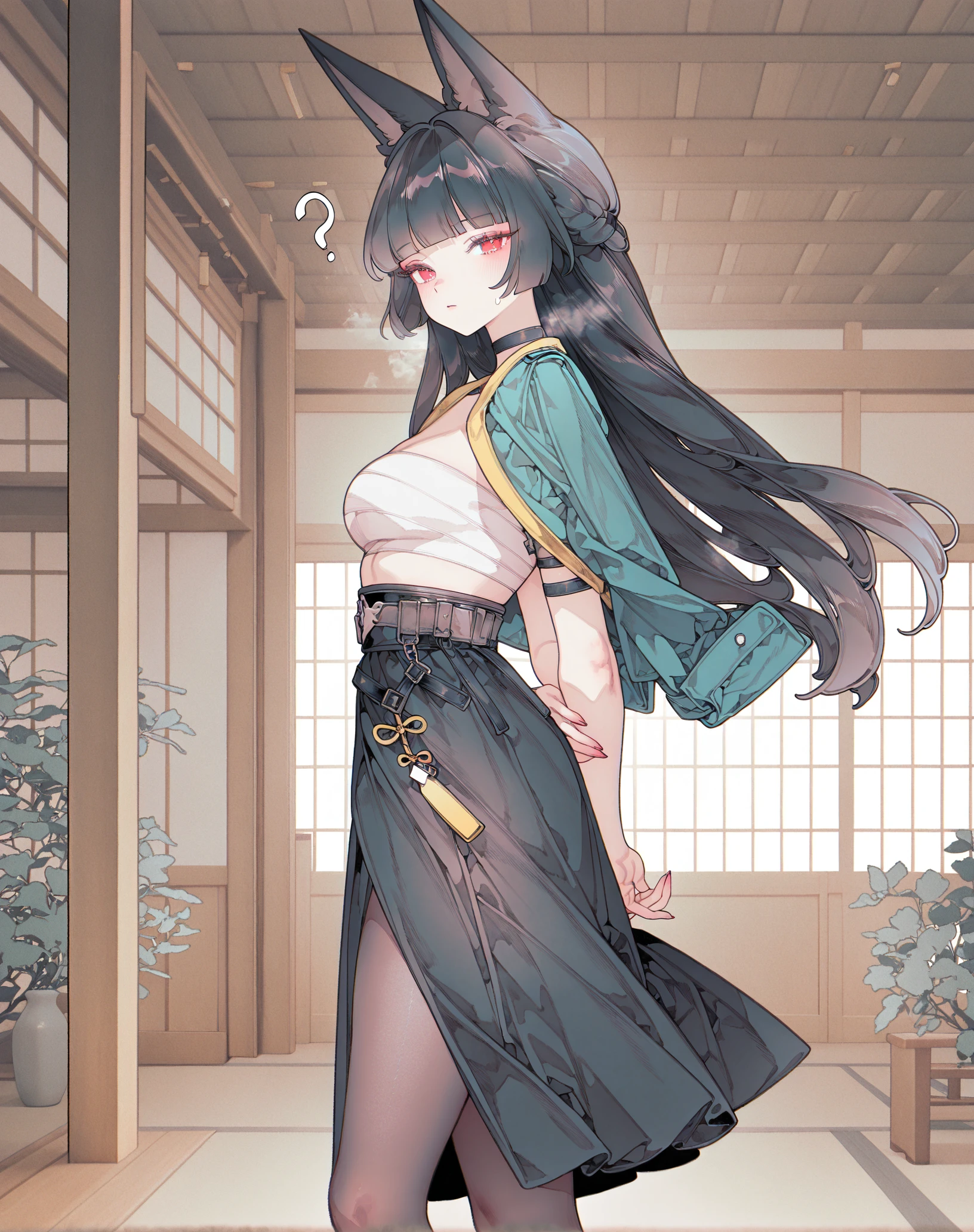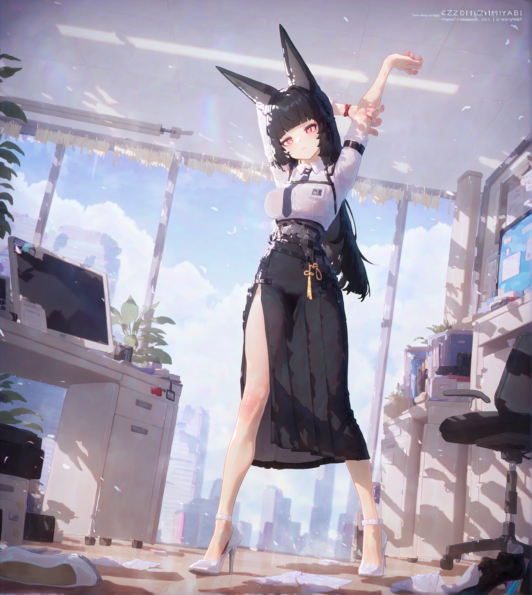 ZZZMiyabi, black hair, long hair, blunt bangs, animal ears, red eyes, Outfit: