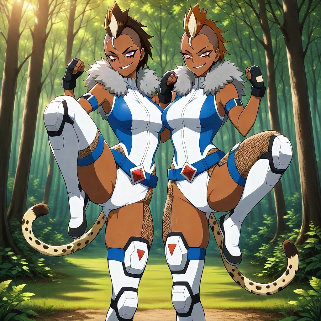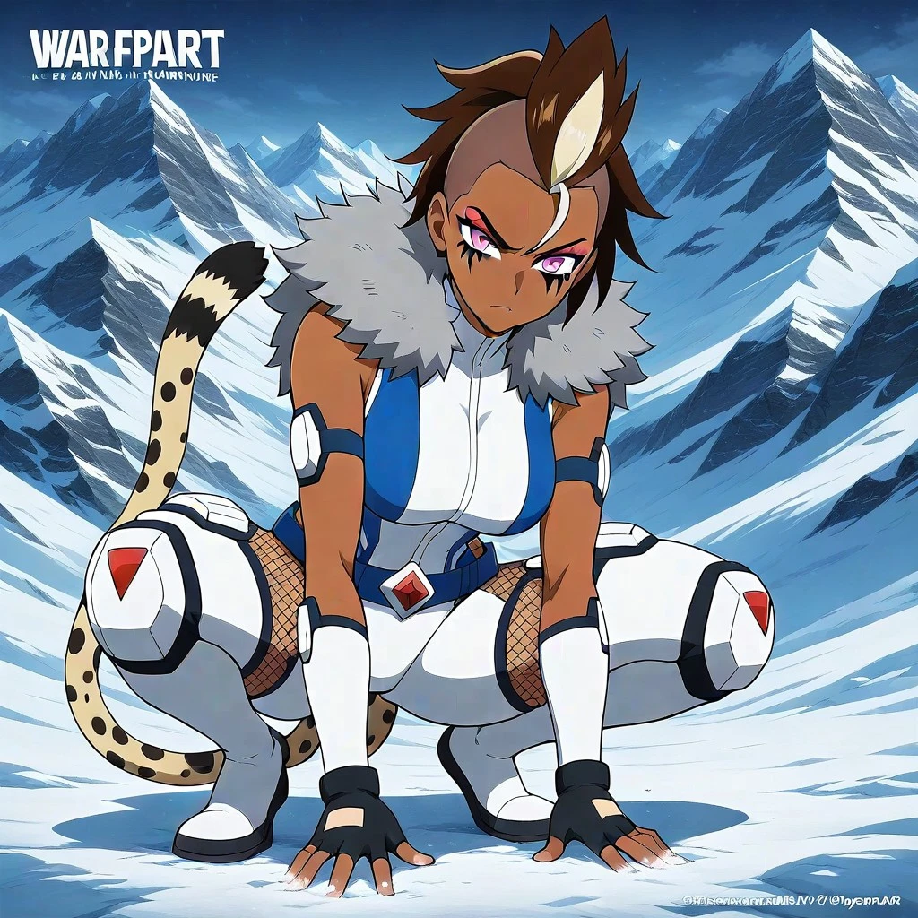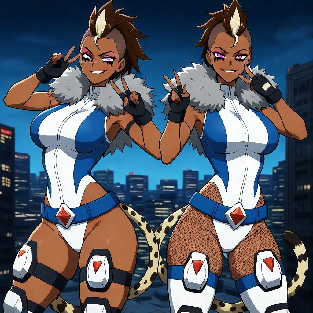 grey fur around her neck, white leotard, blue sides, blue belt, red diamond belt buckle, black fingerless gloves, fishnet thigh cutout, sleeveless, thigh highs, sci-fi armor, thigh-highs,