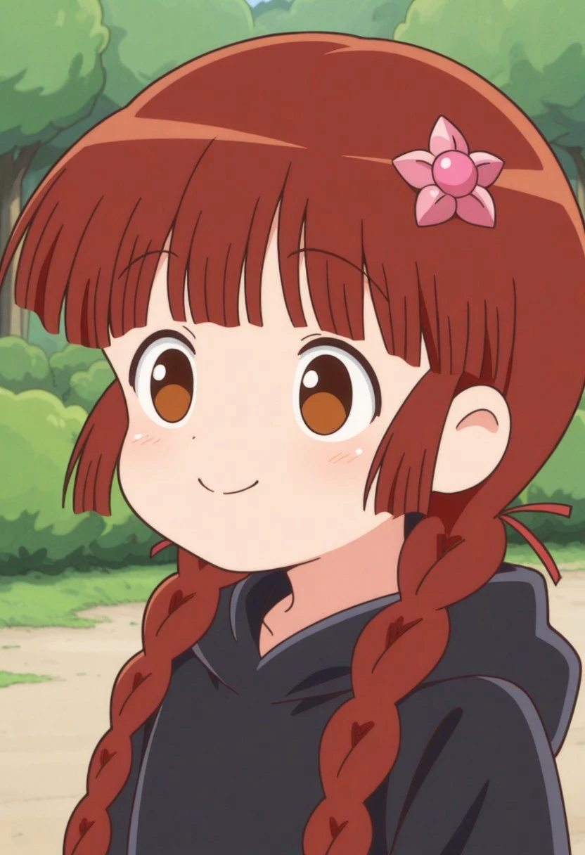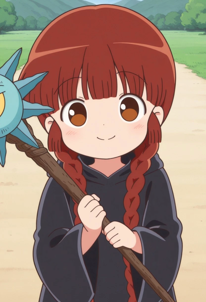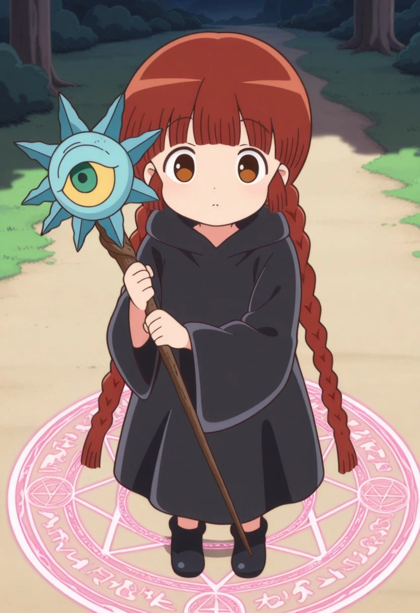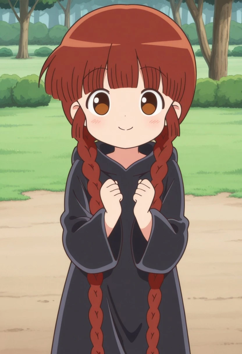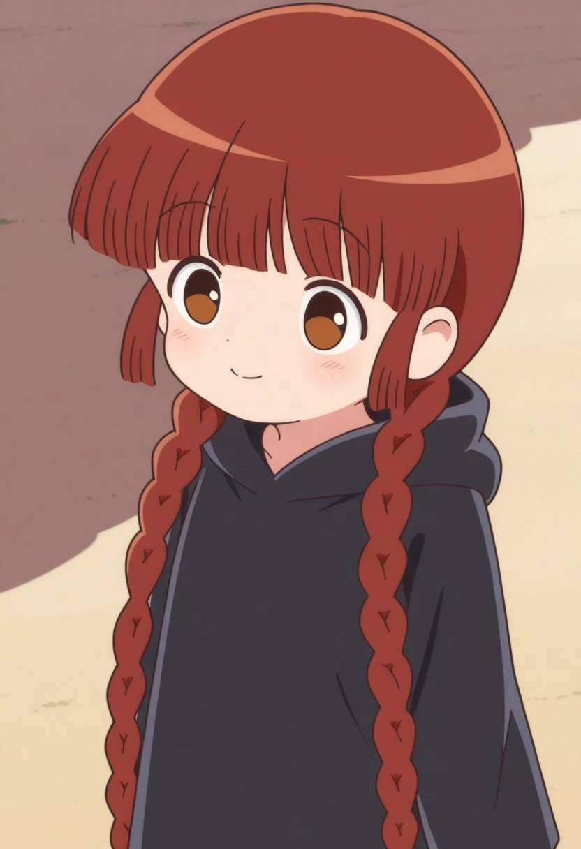kukurijin, 1girl, solo, brown eyes, brown hair, long hair, twin braids, black robe, hood, black footwear,