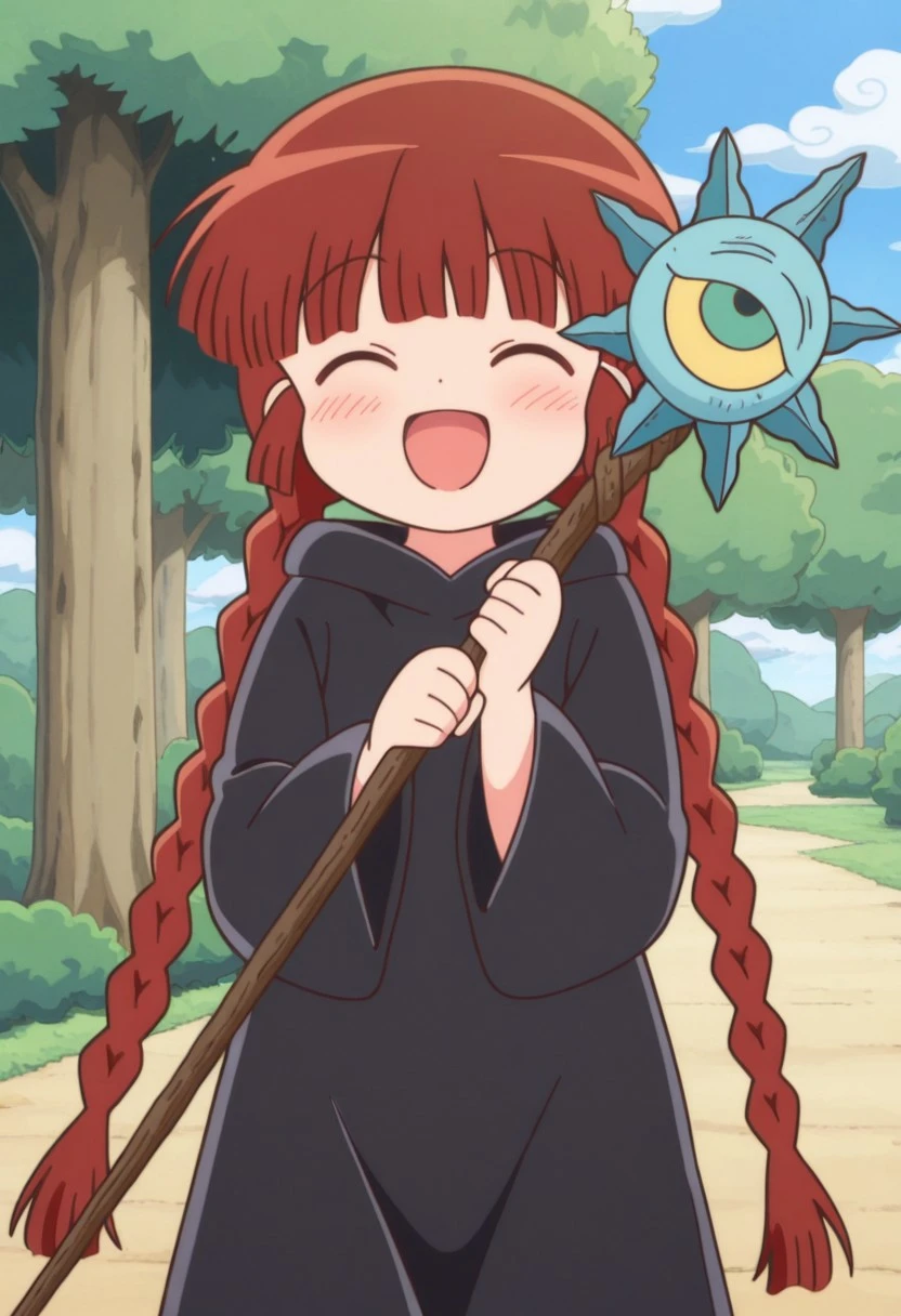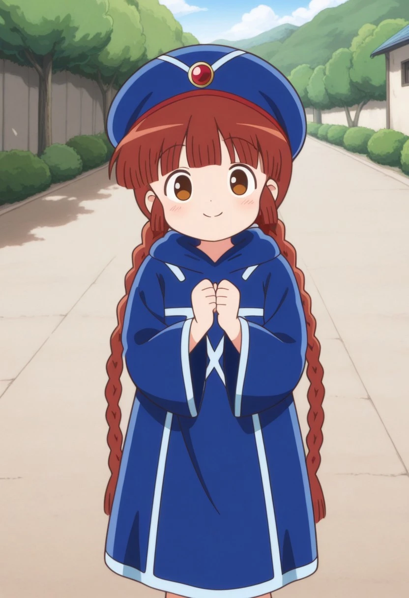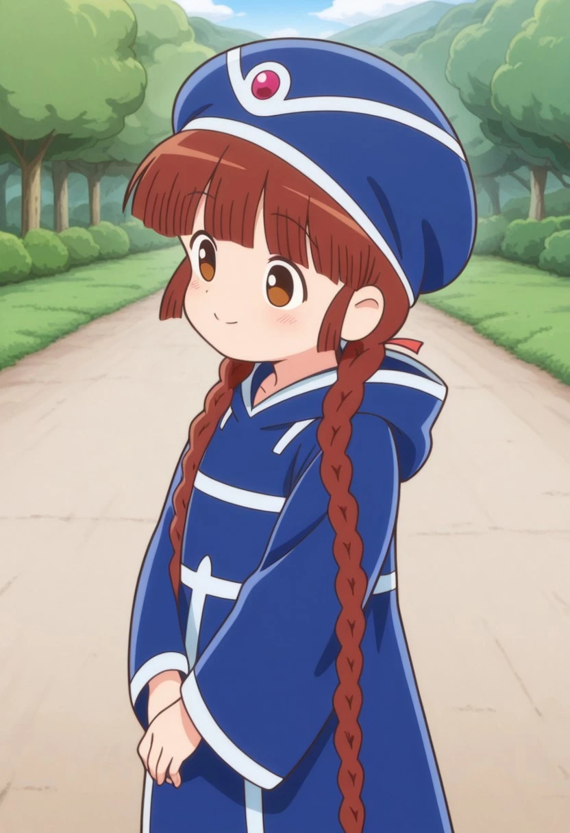 kukurijin, 1girl, solo, brown eyes, brown hair, long hair, twin braids, hat, blue headwear, red gem hat ornament, blue robe, blue footwear,