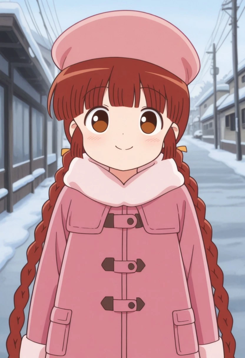 kukurijin, 1girl, solo, brown eyes, brown hair, long hair, twin braids, hat, beret, pink headwear, coat, pink coat,