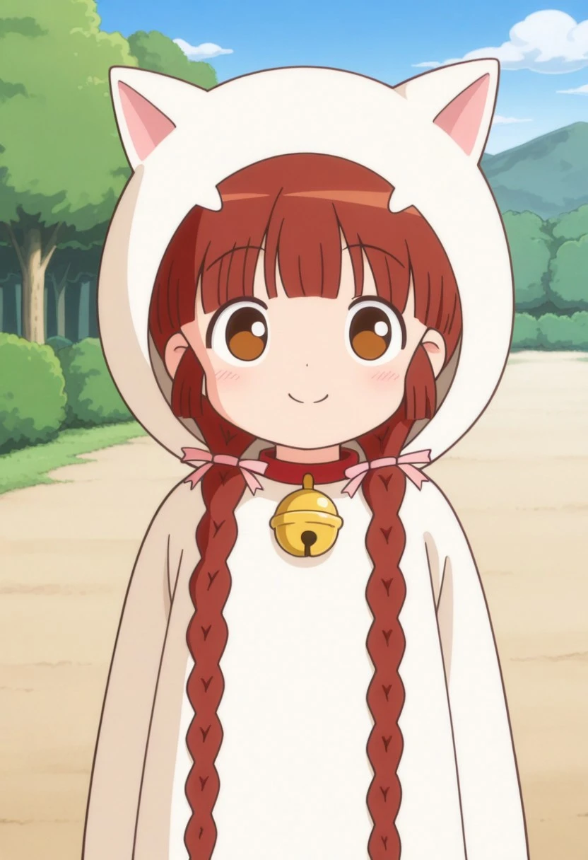 kukurijin, 1girl, solo, brown eyes, brown hair, long hair, twin braids, cat costume, hood up, neck bell, pink footwear,
