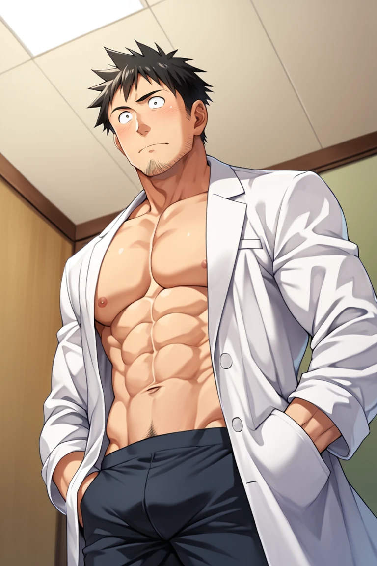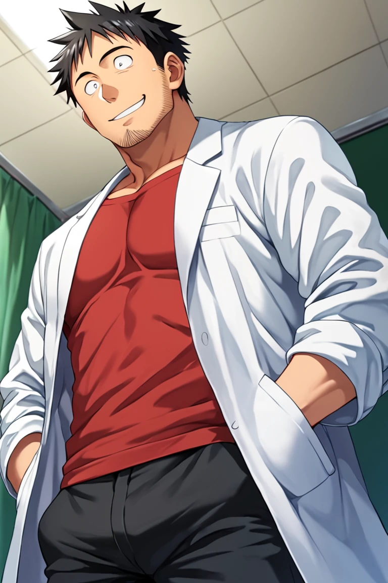 Prompt: Tetsuo Takahashi, black hair, spiky hair, sideburns, facial hair, stubble, black eyes, sanpaku, constricted pupils, red t-shirt, loose shirt), white labcoat, long labcoat, long sleeves, black pants, black shoes