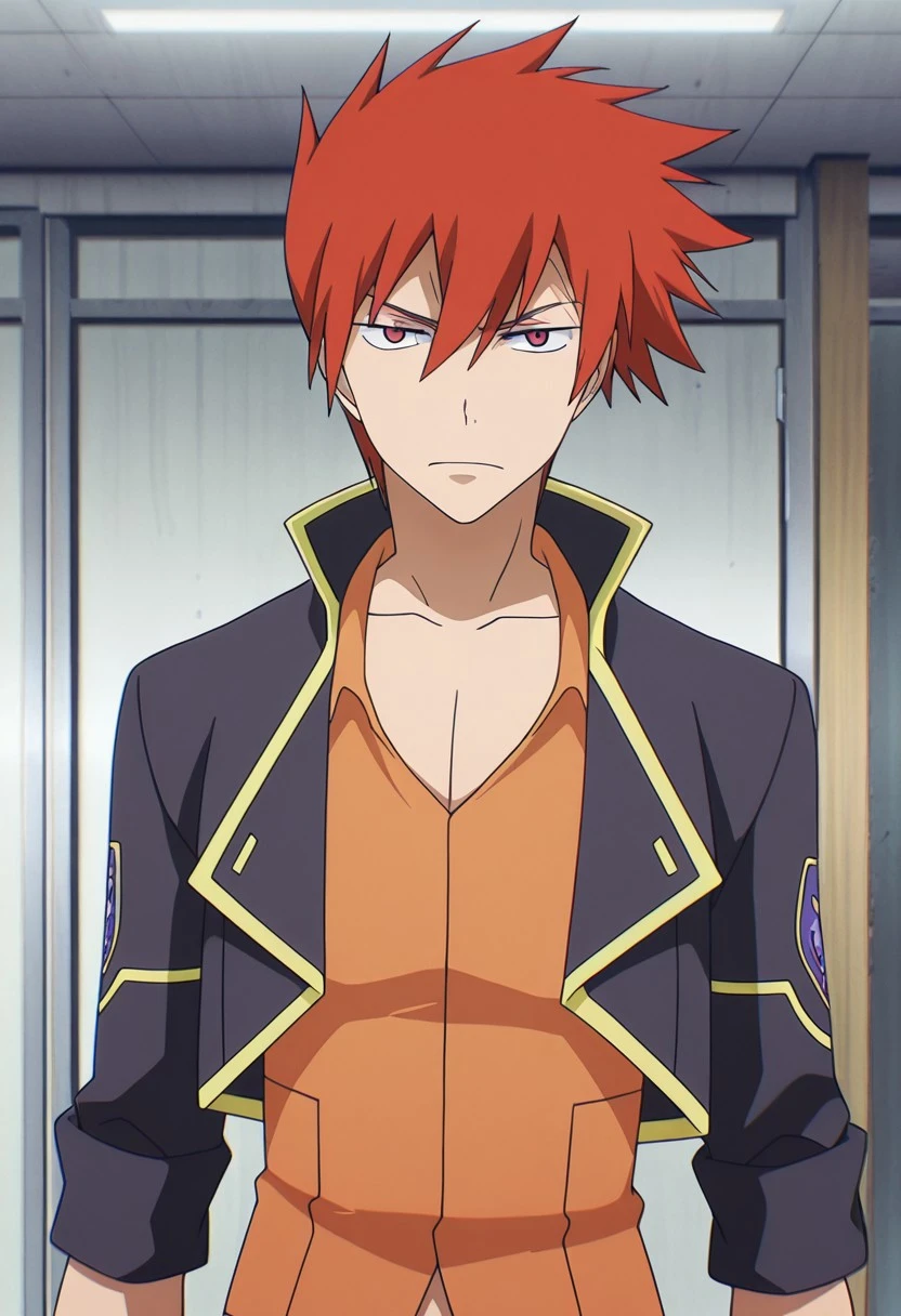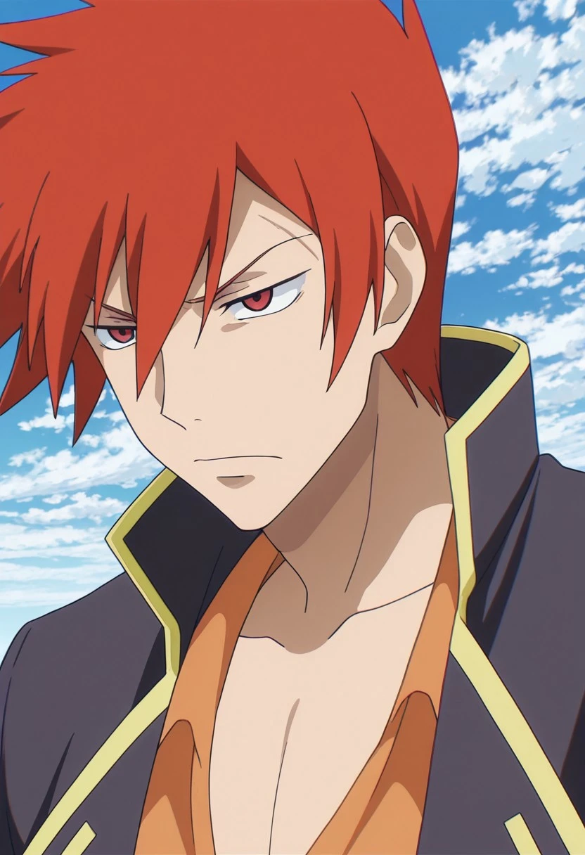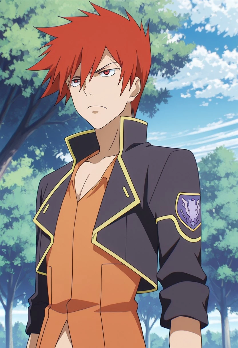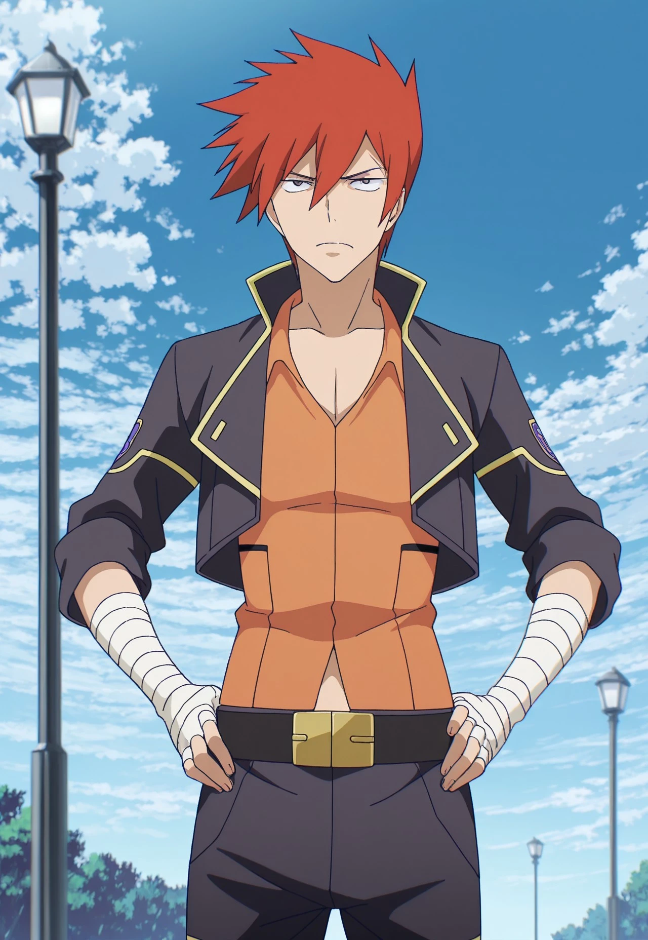1boy, male focus, solo, red eyes, red hair, uniform, collarbone, orange shirt, black jacket, open jacket, cropped jacket, sleeves rolled up, bandaged arm, belt, black pants, boots, black footwear,