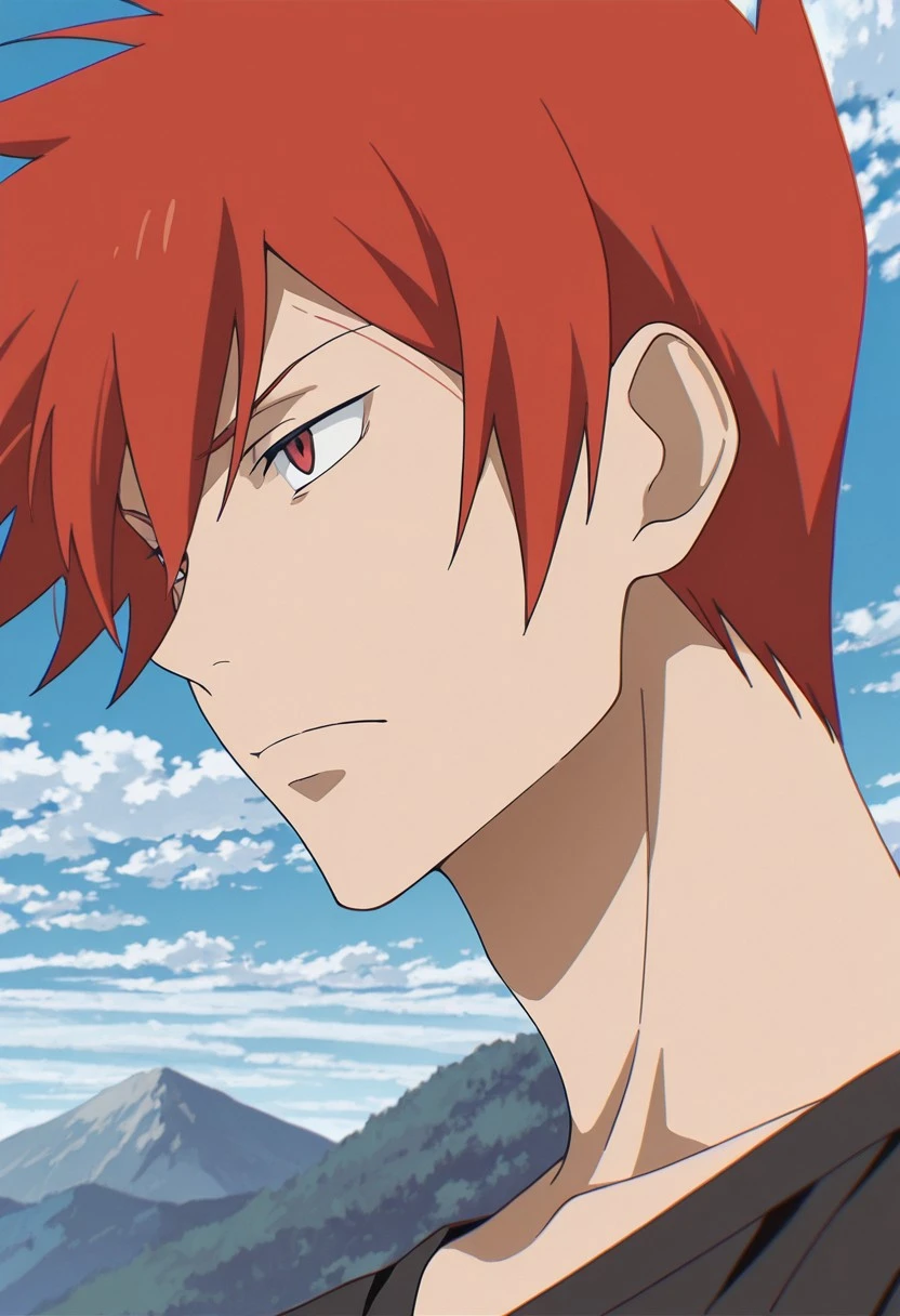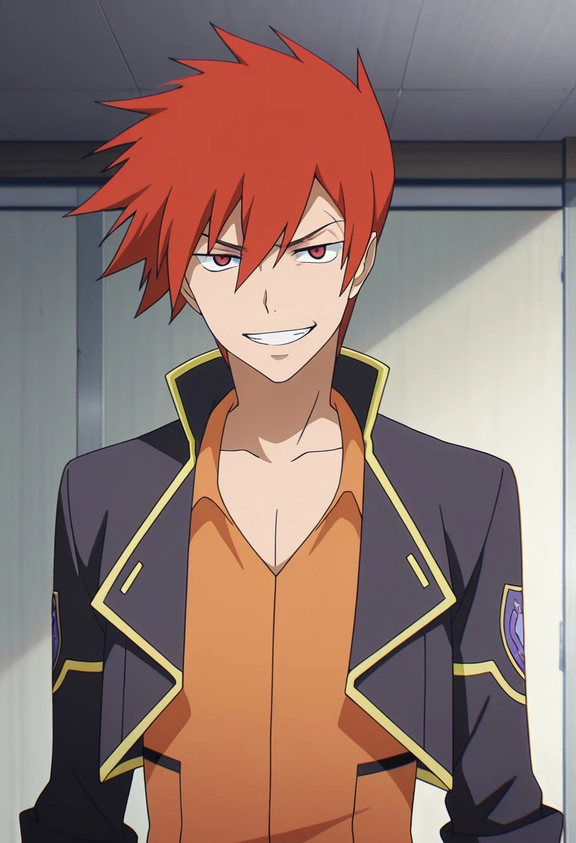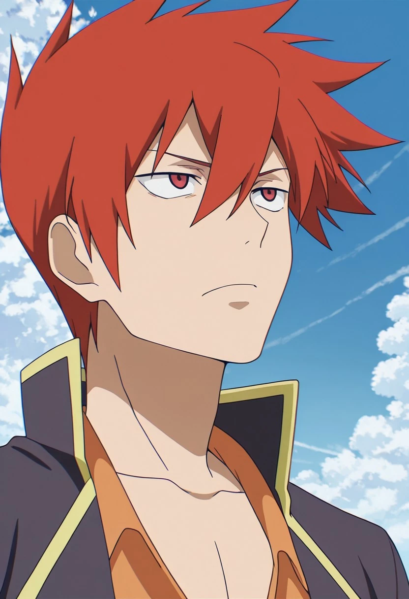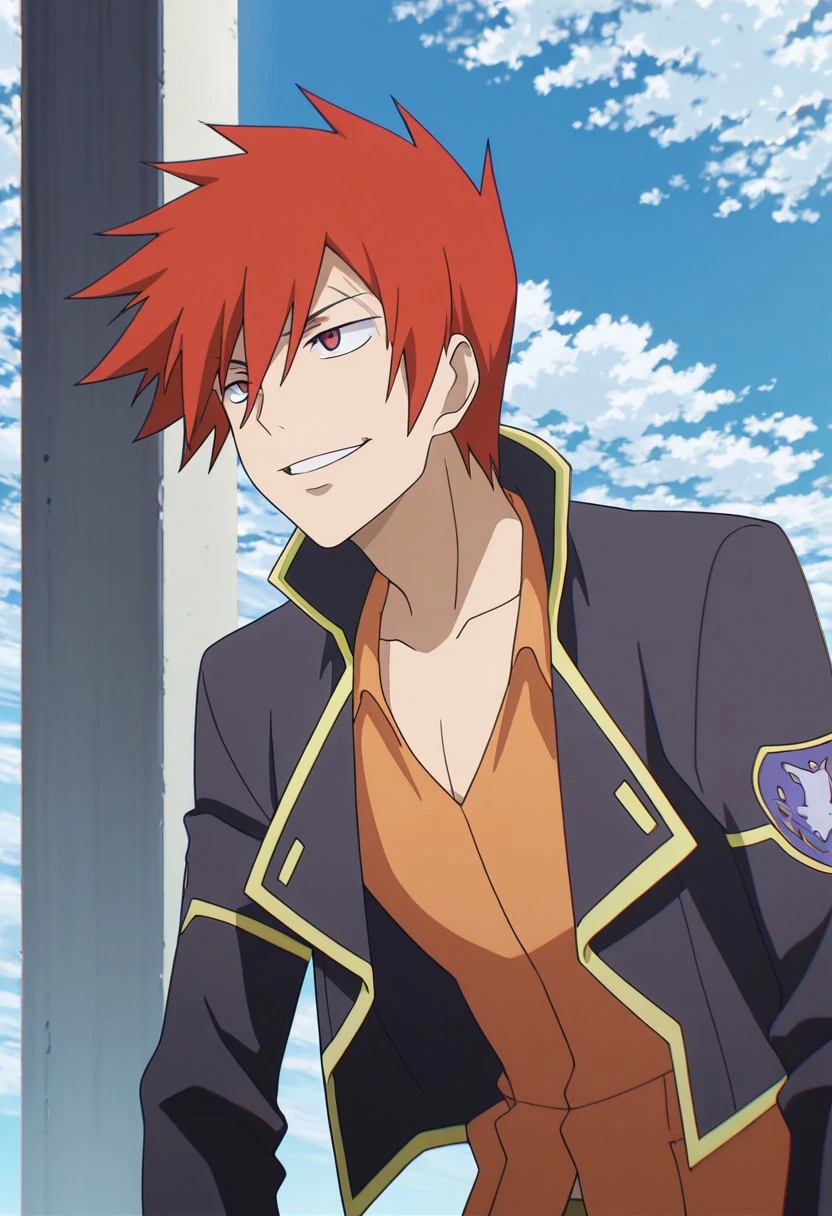 1boy, male focus, solo, red eyes, red hair, uniform, collarbone, orange shirt, black jacket, open jacket, cropped jacket, sleeves rolled up, bandaged arm, belt, black pants, boots, black footwear,