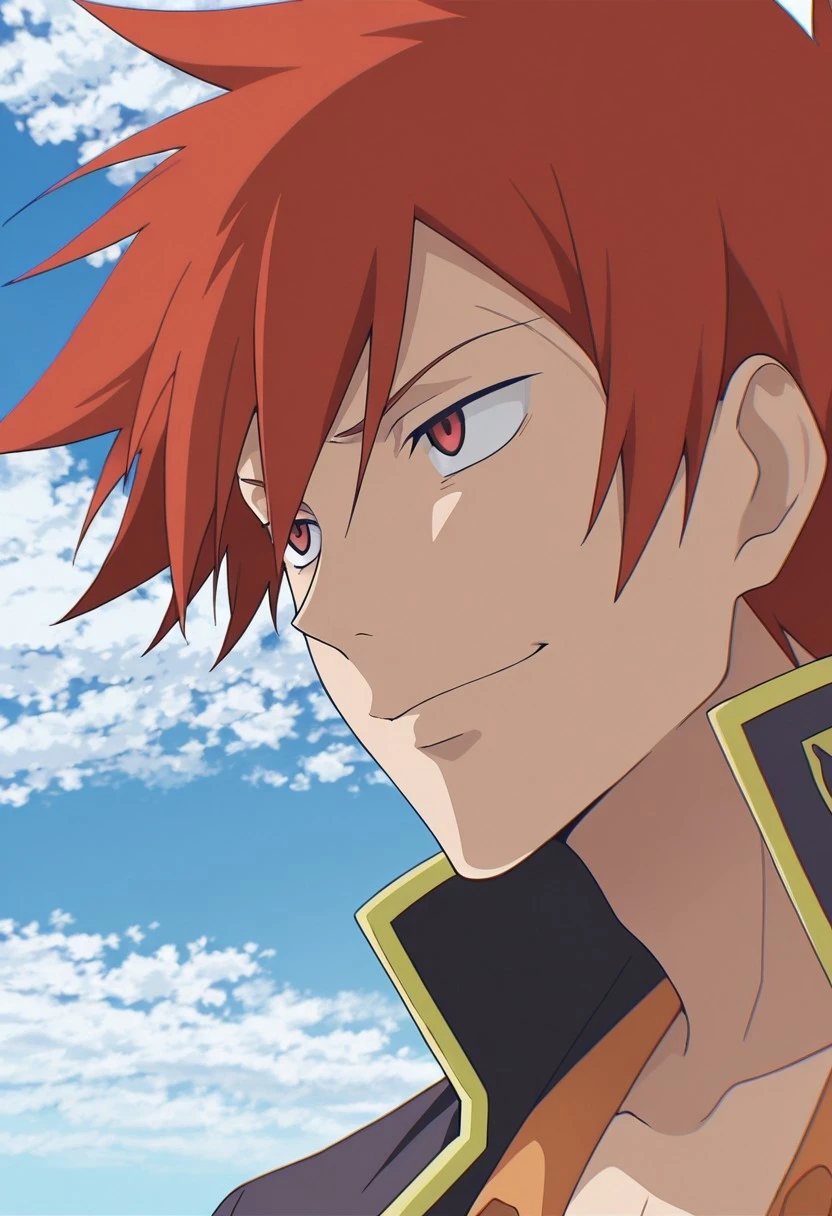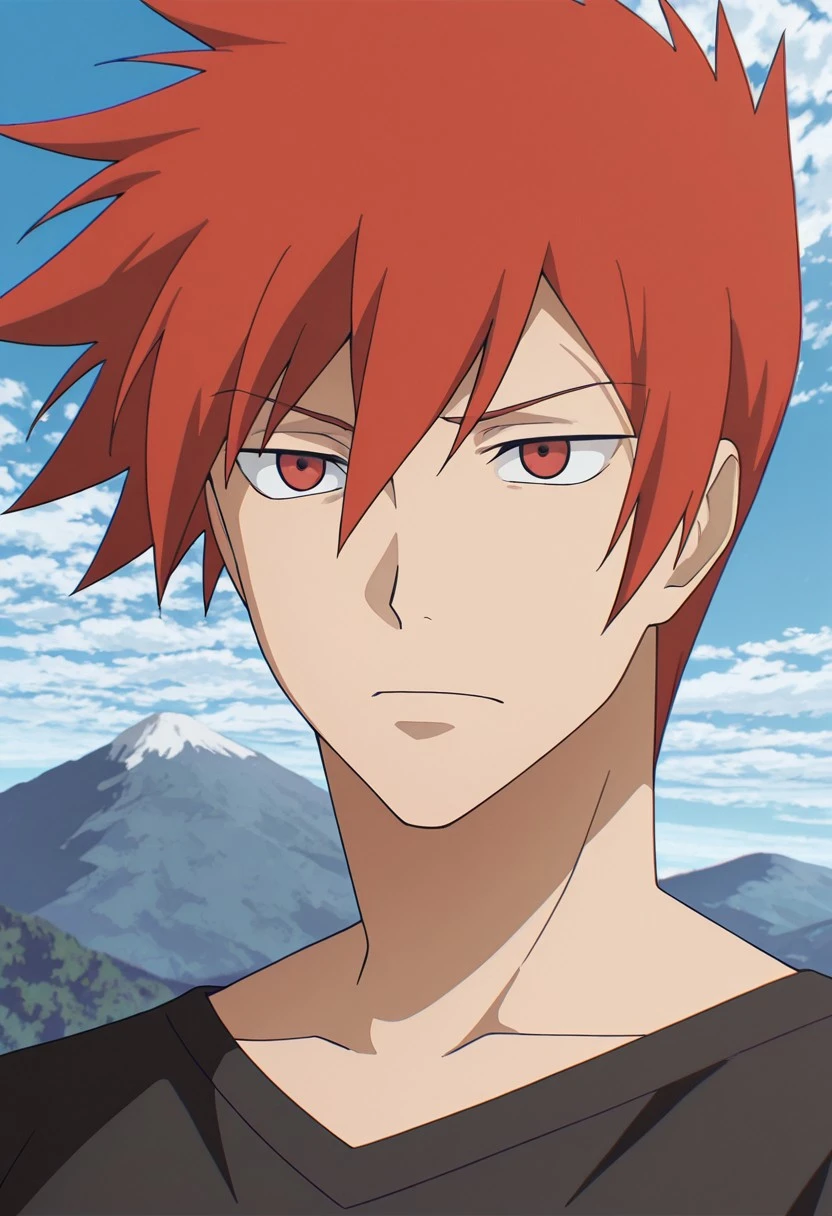 1boy, male focus, solo, red eyes, red hair, orange shirt, collared shirt, open shirt, brown t-shirt, short sleeves, bandaged arm, blue pants, capri pants,