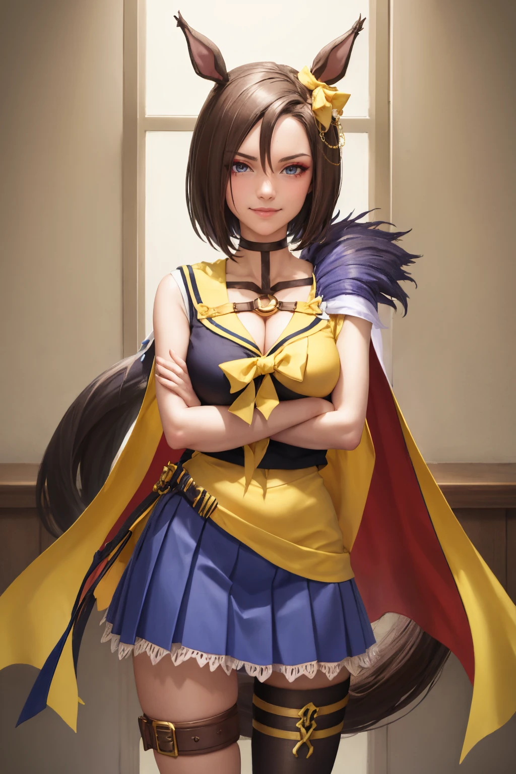 Default Outfit: two-tone shirt, shoulder cutout, yellow sailor collar, bow, cape, blue skirt, thigh strap, single thighhigh, cleavage