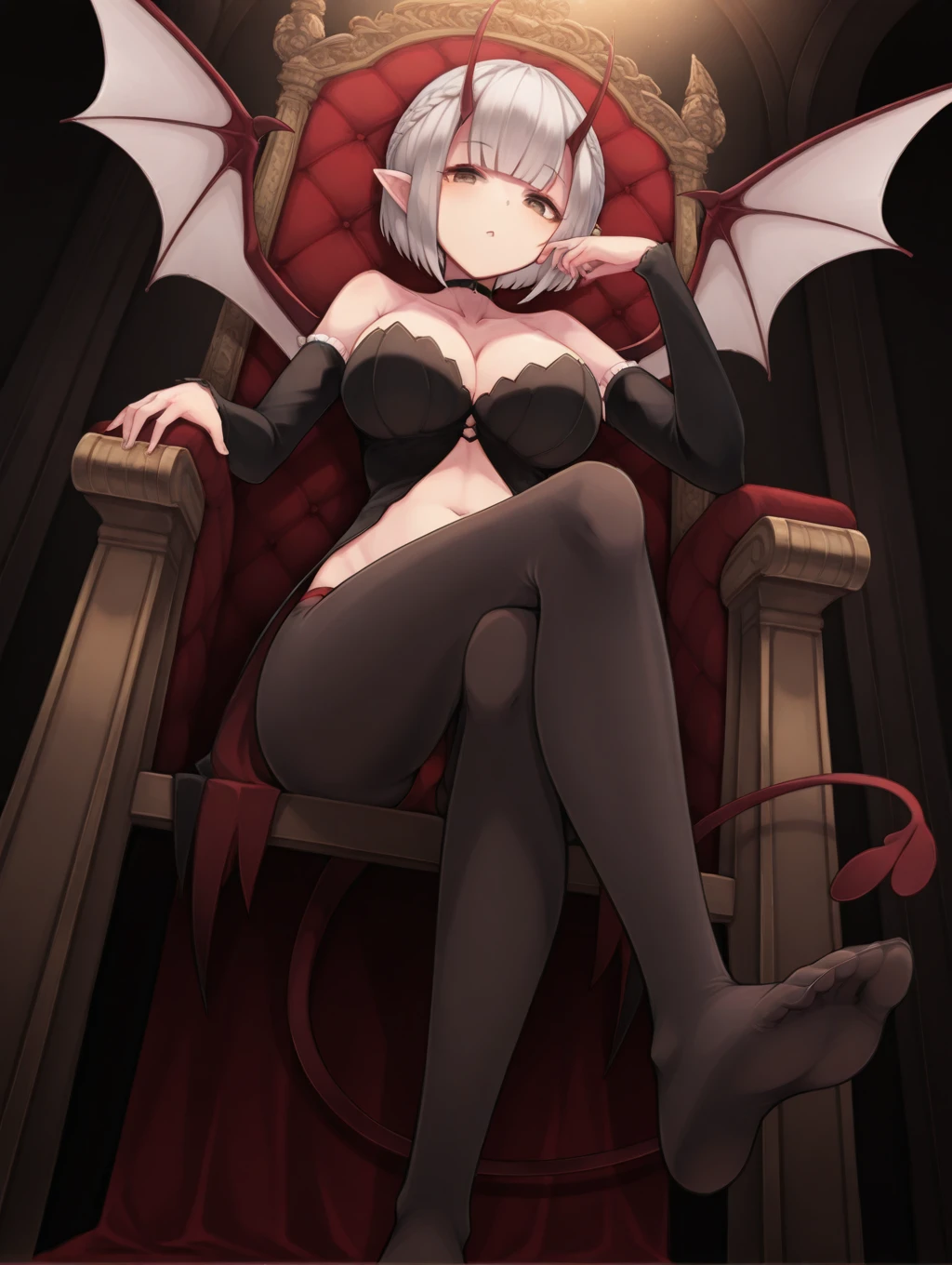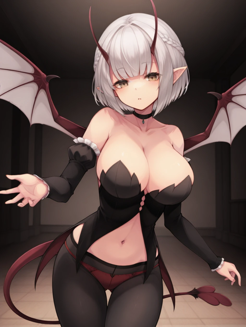 Fulbeua, white hair, short hair, braid, brown eyes, pointy ears, horns, large breasts, red demon wings, white wings, demon tail, slender, cleavage, off_shoulders, choker, black top, drop_tail, detached sleeves, clothing cutout, exposed_navel, (pantyhose), (red_panties),