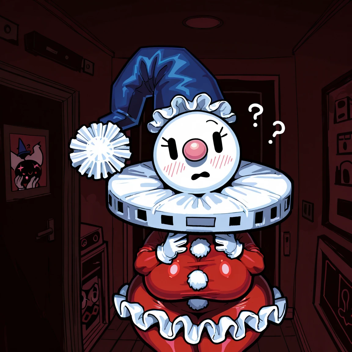 Pierre, (+ shaped eyes,) white head, blue hat, black dots on hat, white fluff on end of hat, red body, white gloves, skirt,
