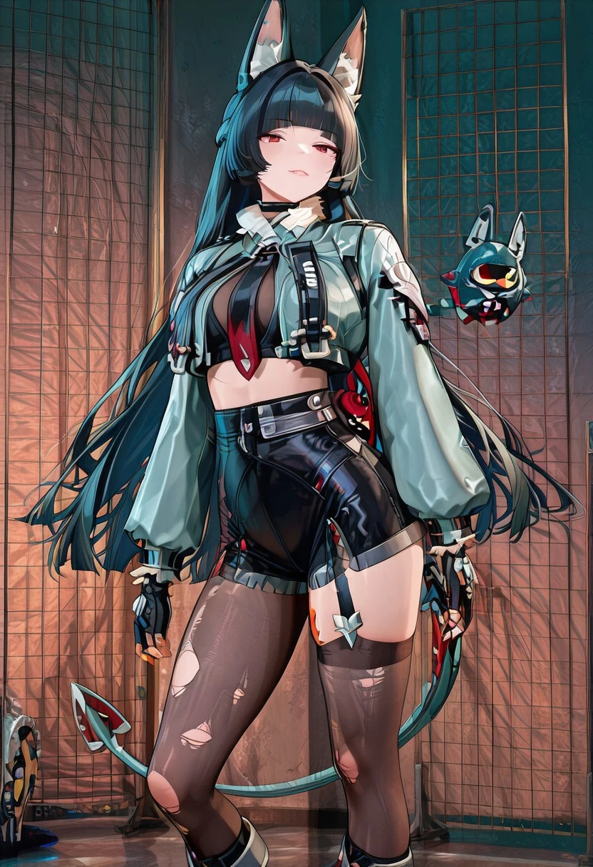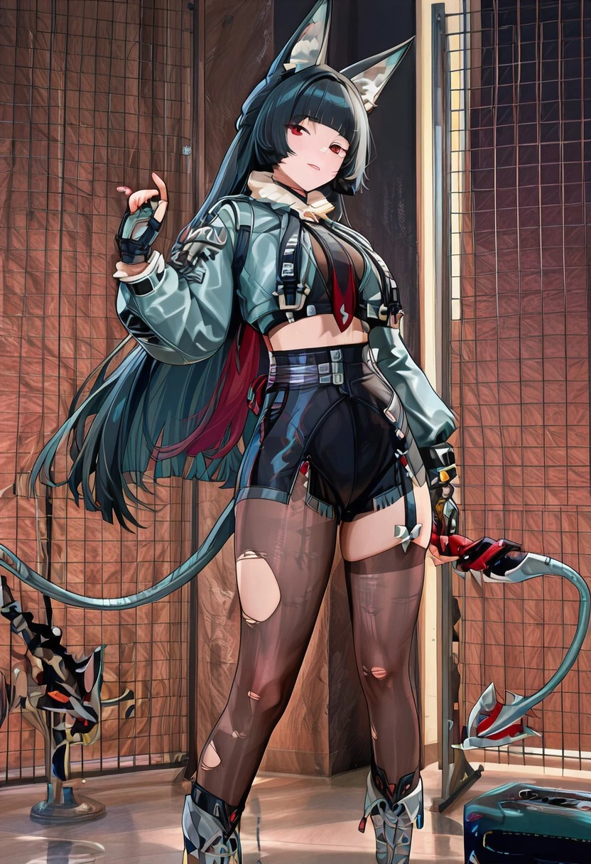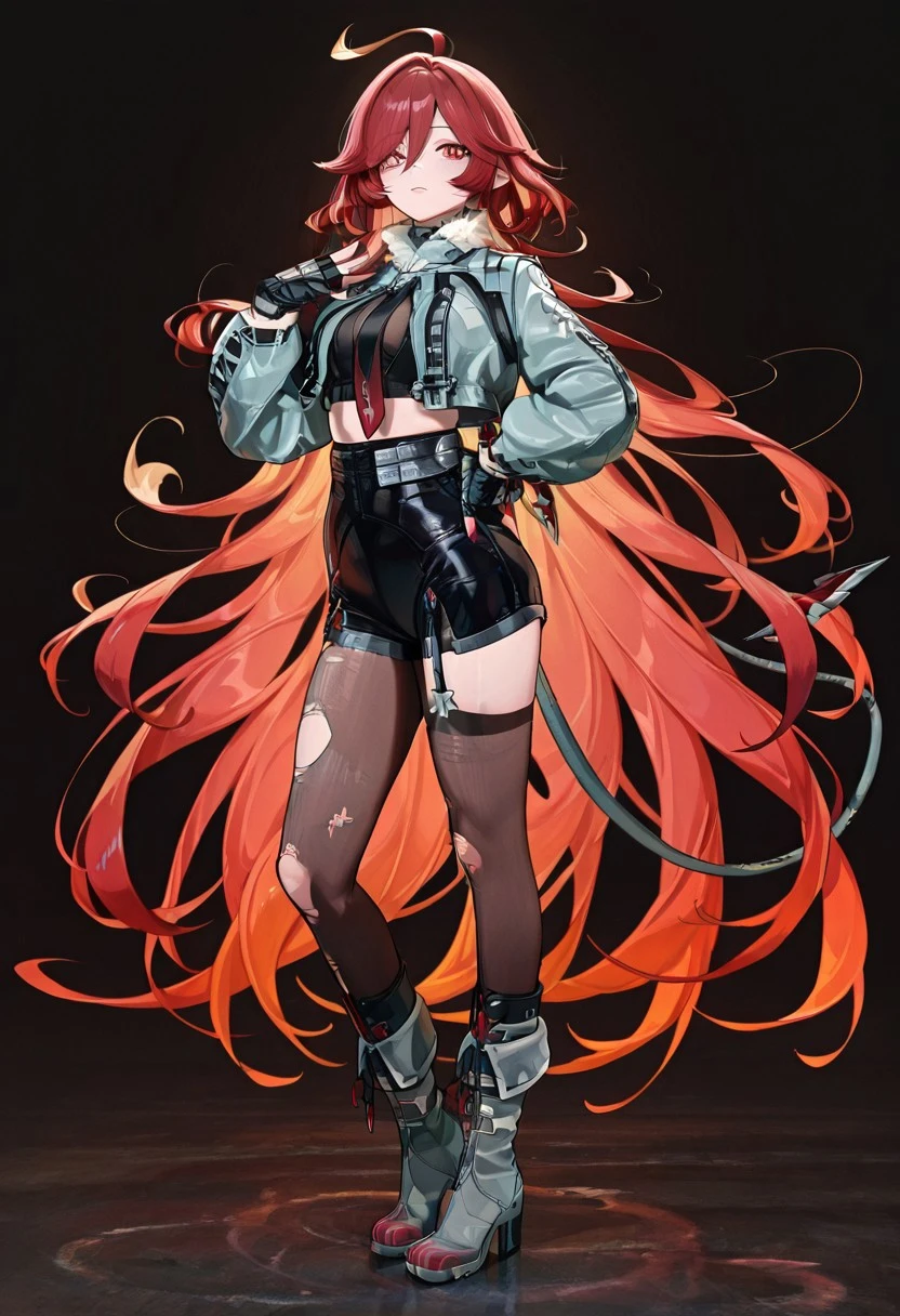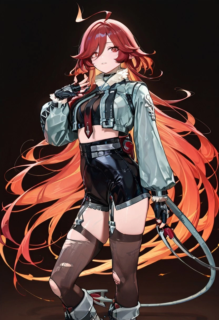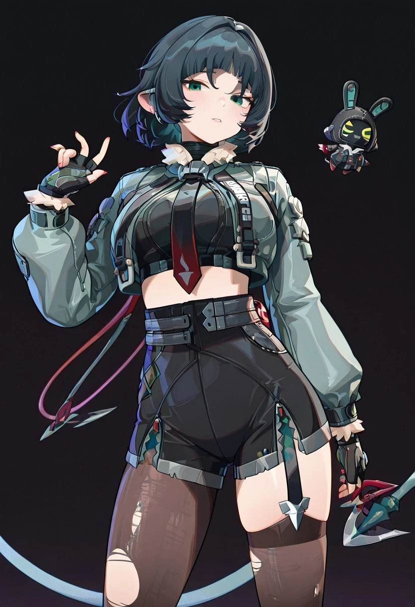 Jandclstyl, grey jacket, cropped jacket, fur-trimmed jacket, black crop top, necktie, black fingerless gloves, black shorts, high-waist shorts, midriff, thighhigh, pantyhose, single garter strap, torn legwear, asymmetrical legwear, grey footwear, knee boots